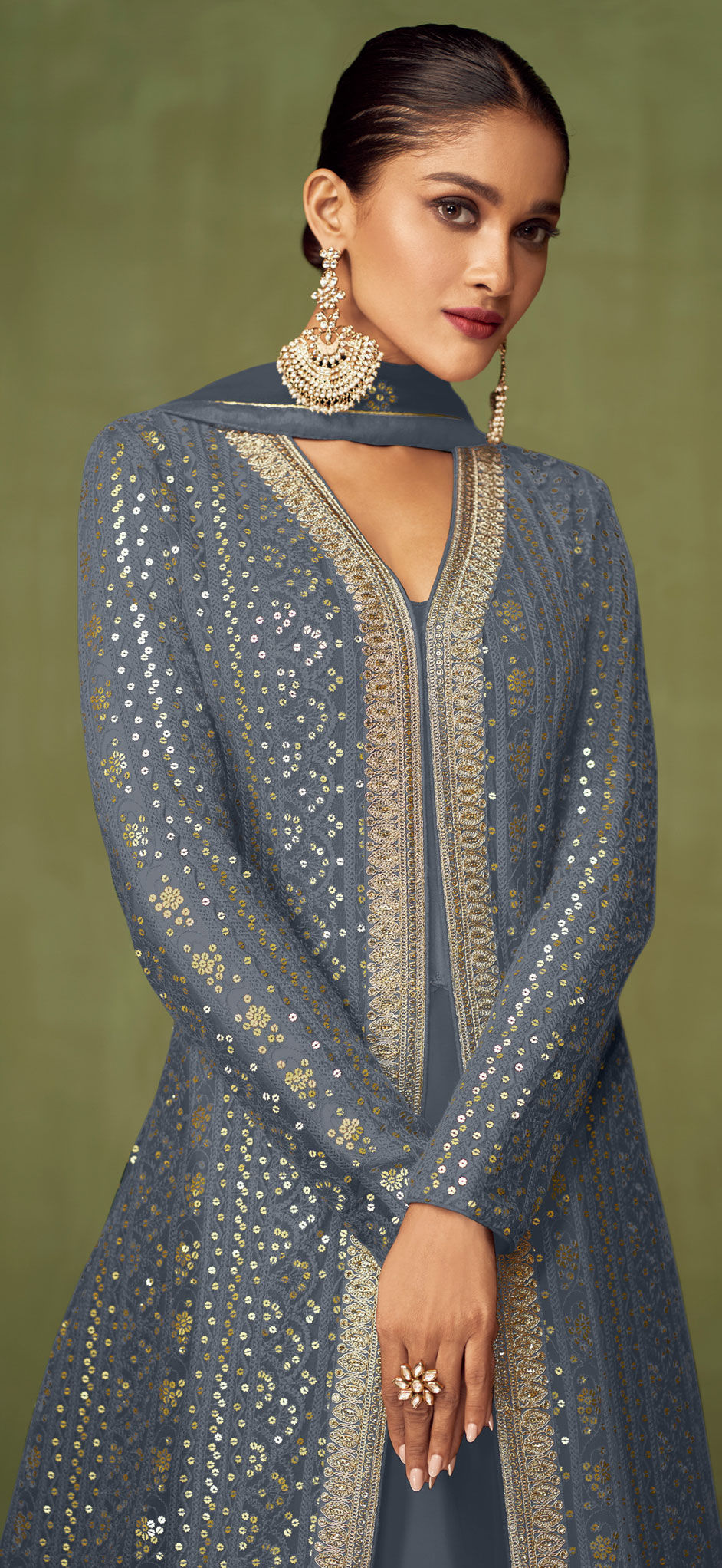 Black and Grey color Salwar Kameez in Georgette fabric with Embroidered, Sequence, Thread, Zari work