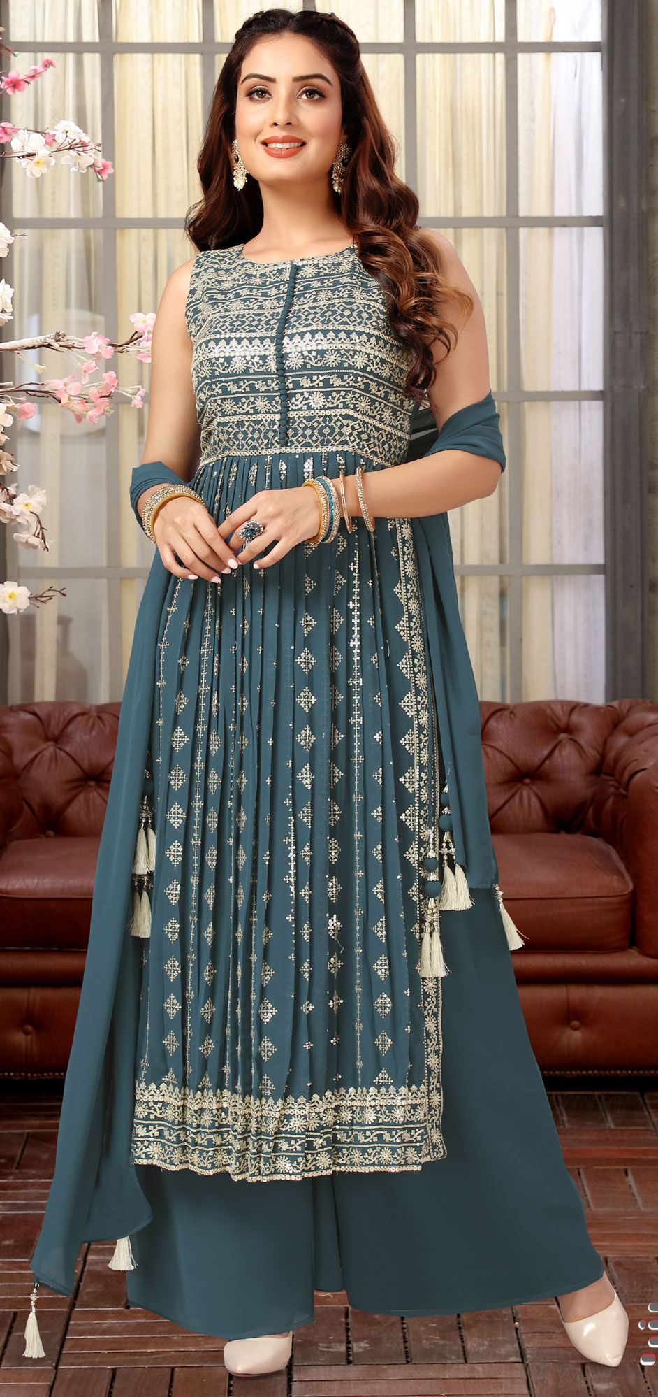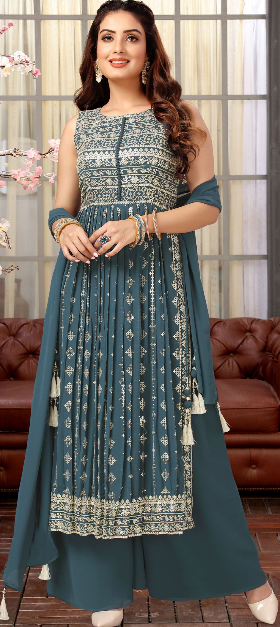 Blue color Salwar Kameez in Georgette fabric with Embroidered, Sequence, Thread, Zari work