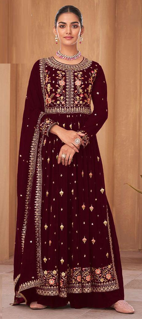 Red and Maroon color Salwar Kameez in Georgette fabric with Embroidered, Resham, Thread, Zari work