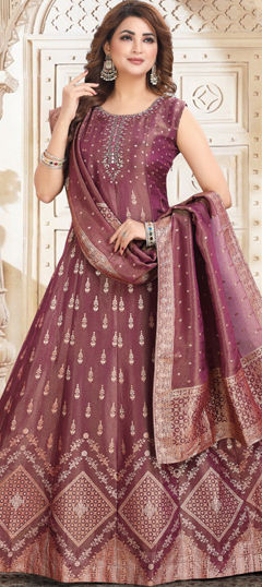 Red and Maroon color Salwar Kameez in Jacquard, Tissue fabric with Cut Dana, Weaving, Zardozi, Zari work