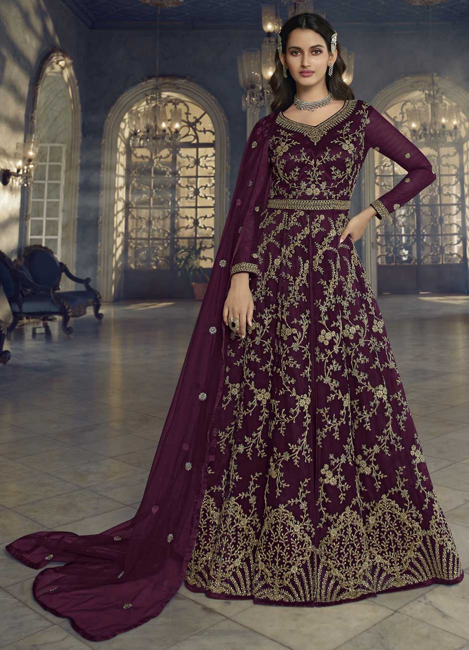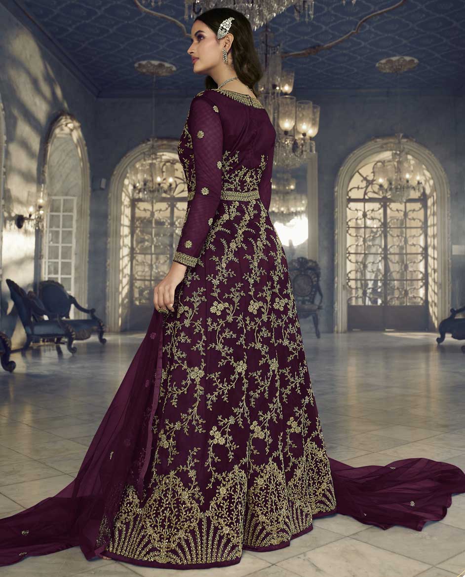 Purple and Violet color Salwar Kameez in Net fabric with Embroidered, Thread, Zari work