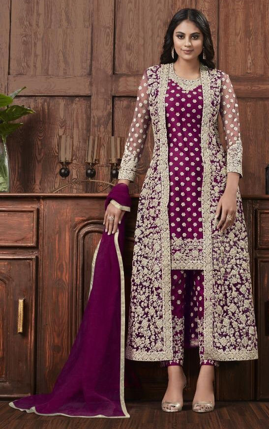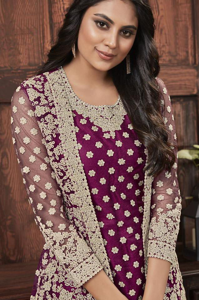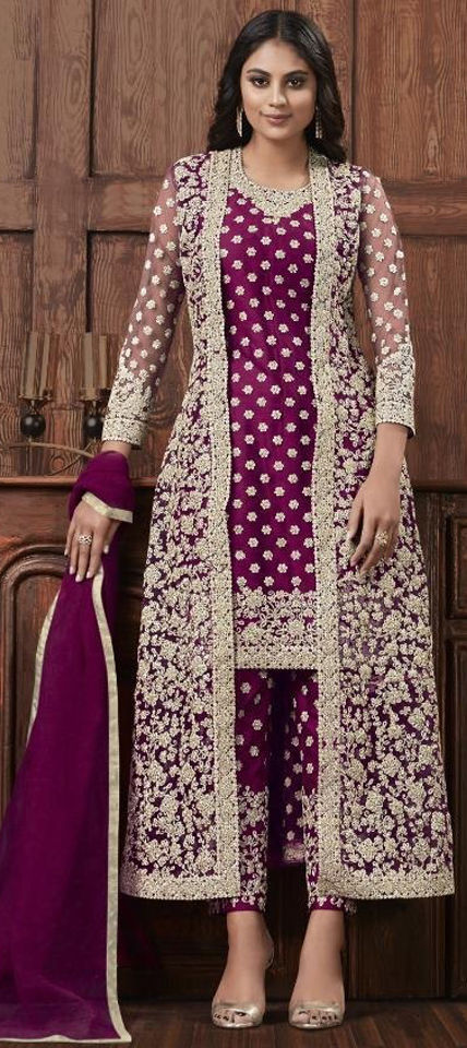 Purple and Violet color Salwar Kameez in Net fabric with Embroidered, Stone, Thread, Zari work