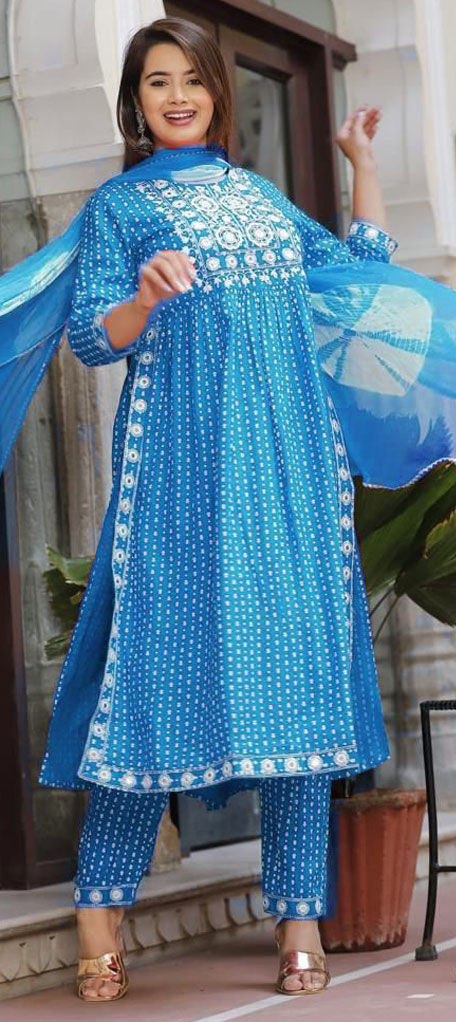 Blue color Salwar Kameez in Rayon fabric with Embroidered, Mirror, Resham, Thread work