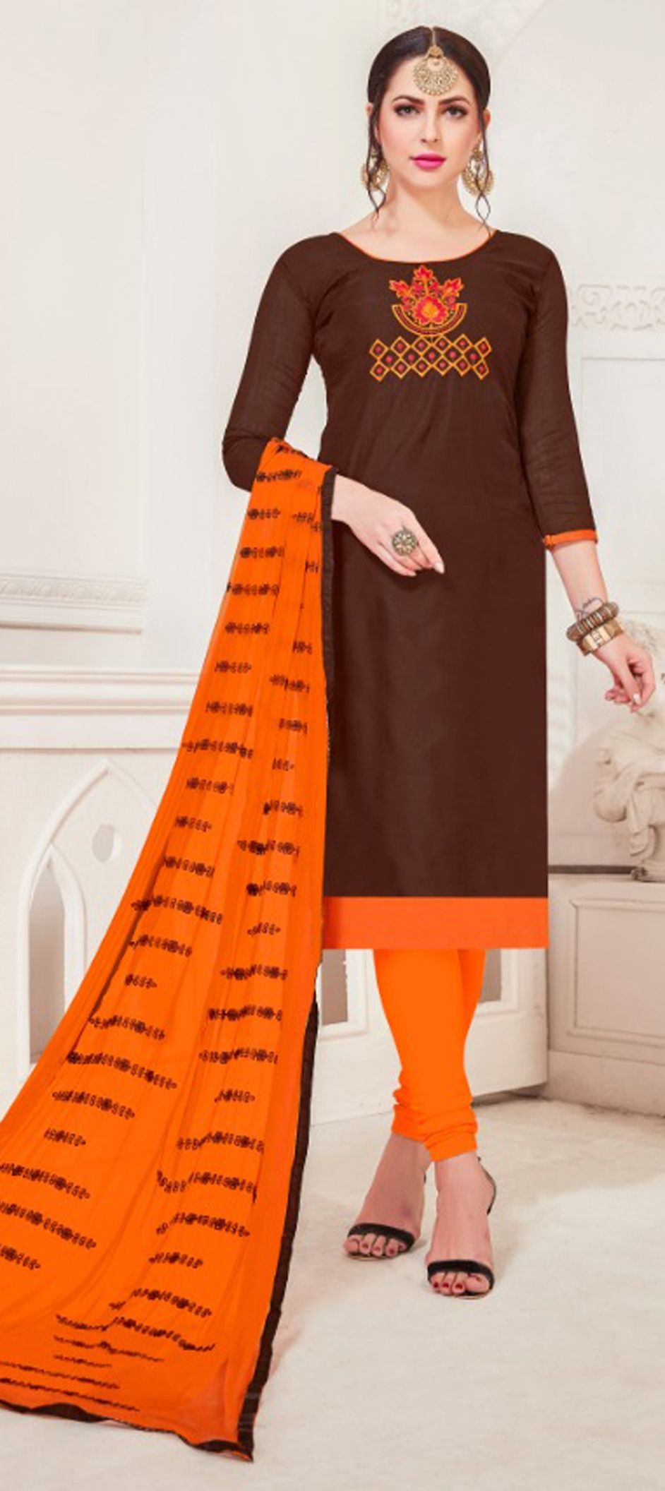 Beige and Brown color Salwar Kameez in Silk cotton fabric with Embroidered, Resham, Thread work