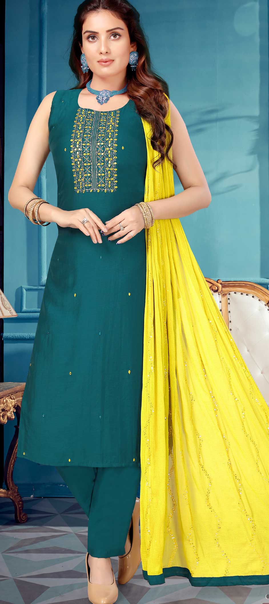 Gold color Salwar Kameez in Silk fabric with Embroidered, Sequence, Thread work