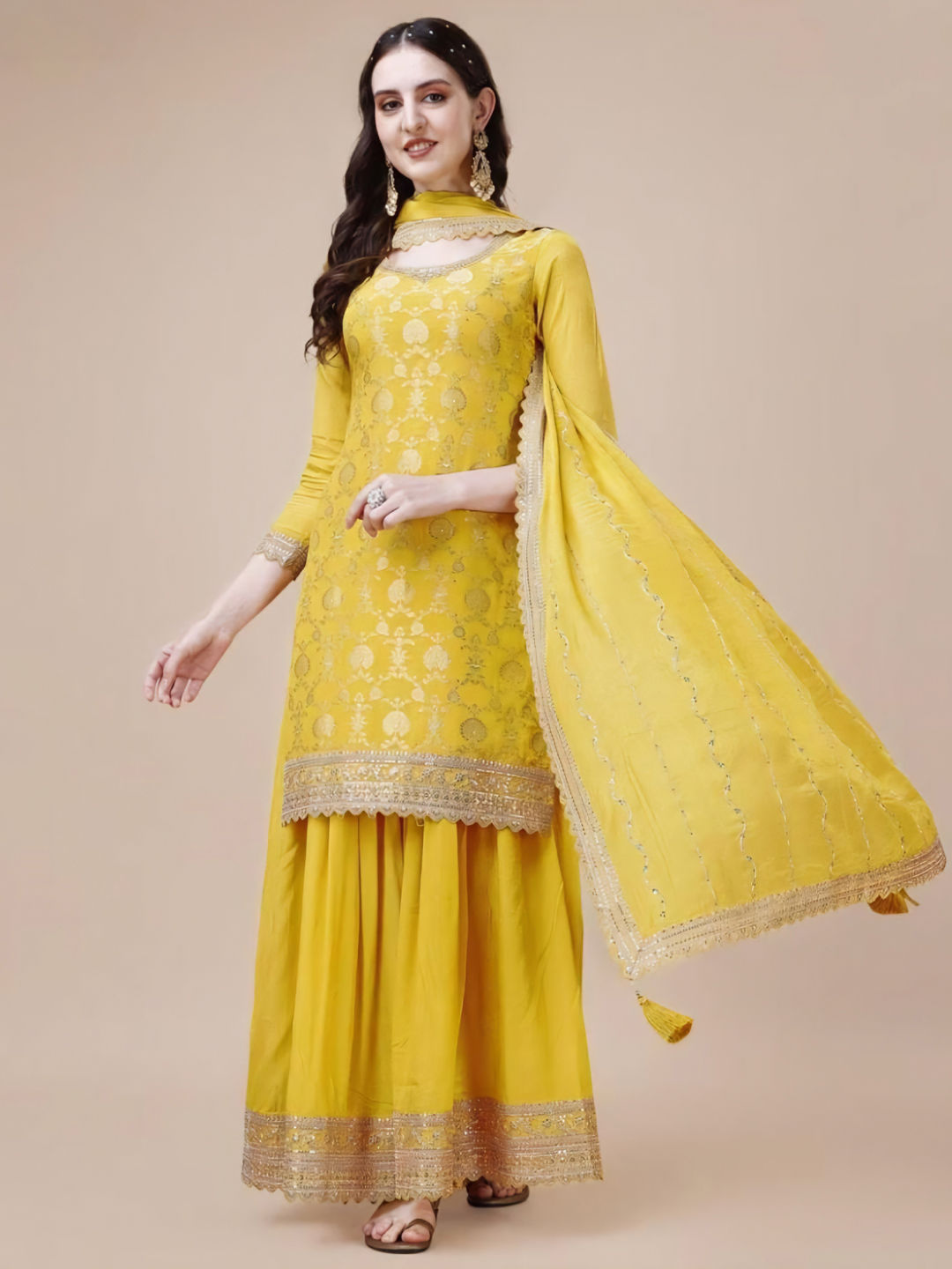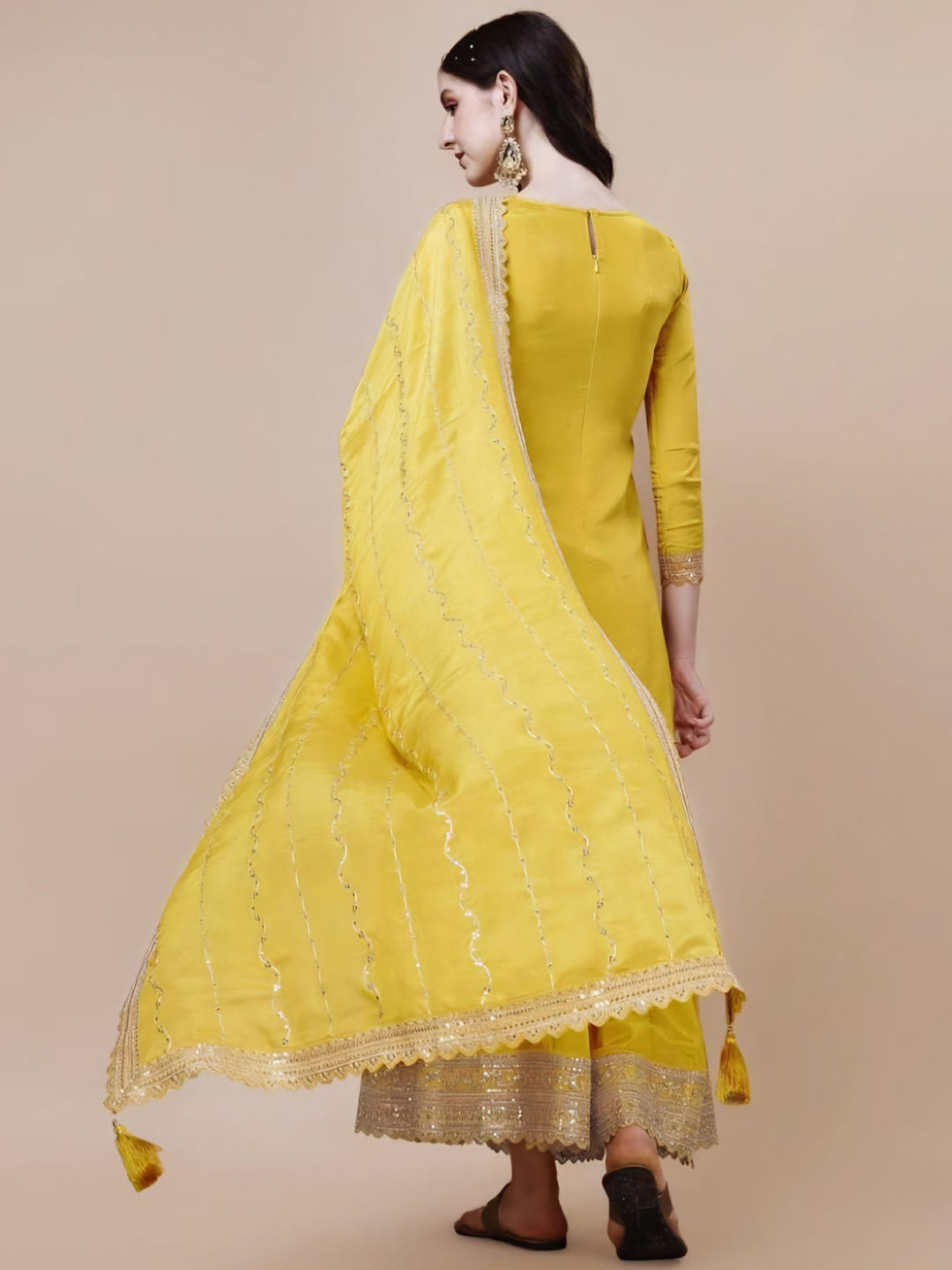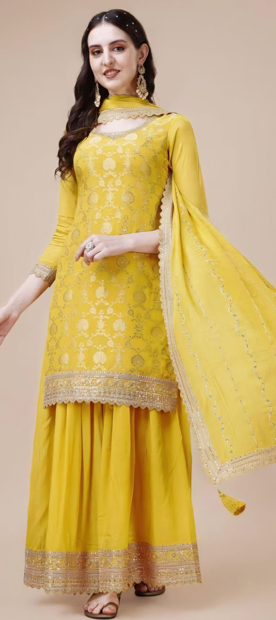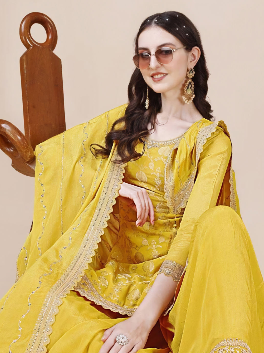 Yellow color Salwar Kameez in Silk fabric with Embroidered, Thread work