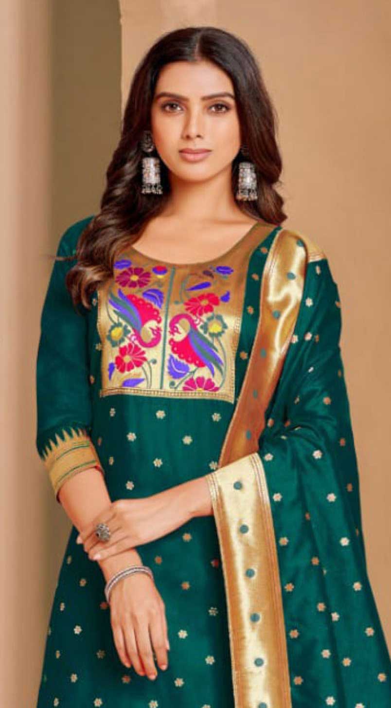 Green color Salwar Kameez in Silk fabric with Weaving work