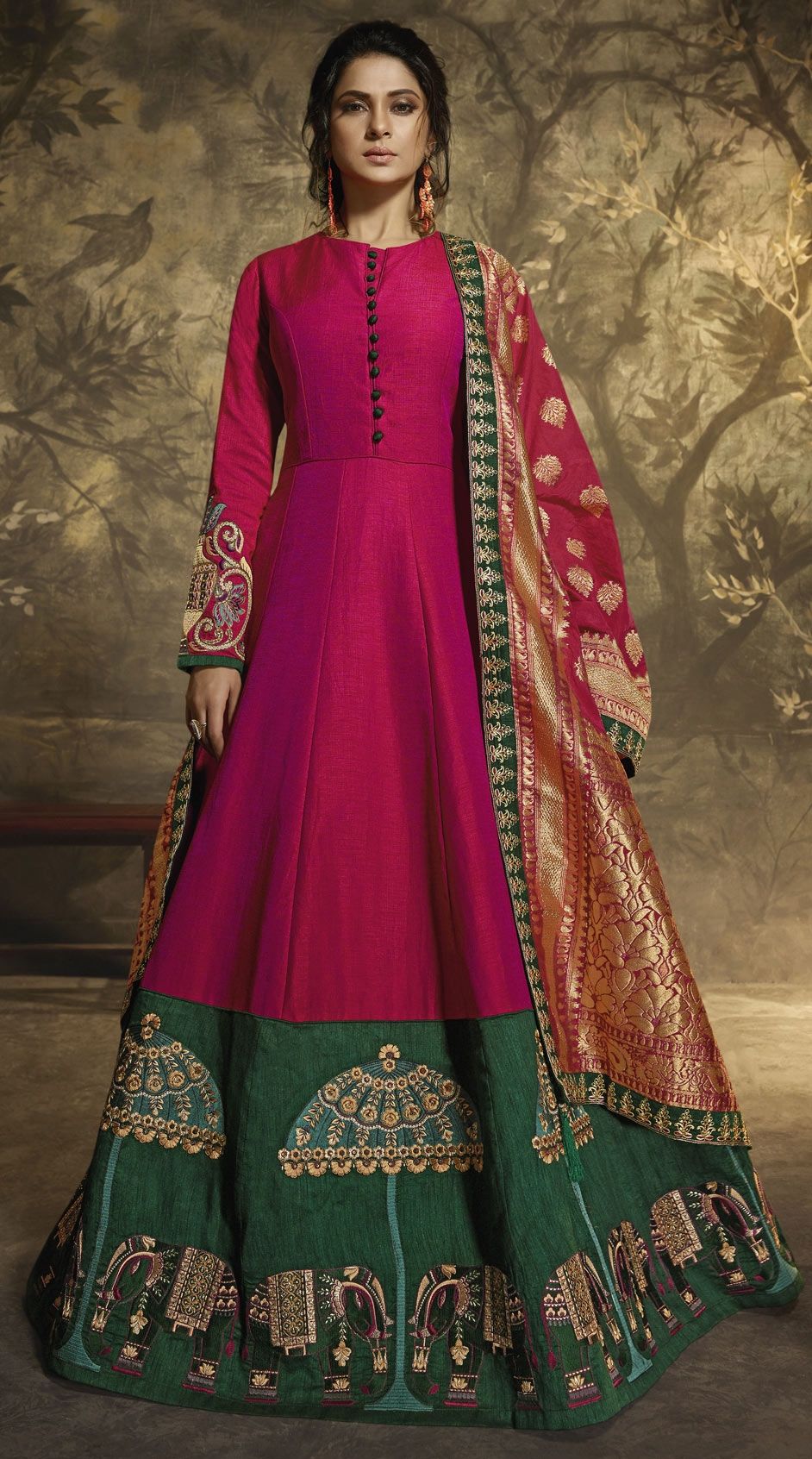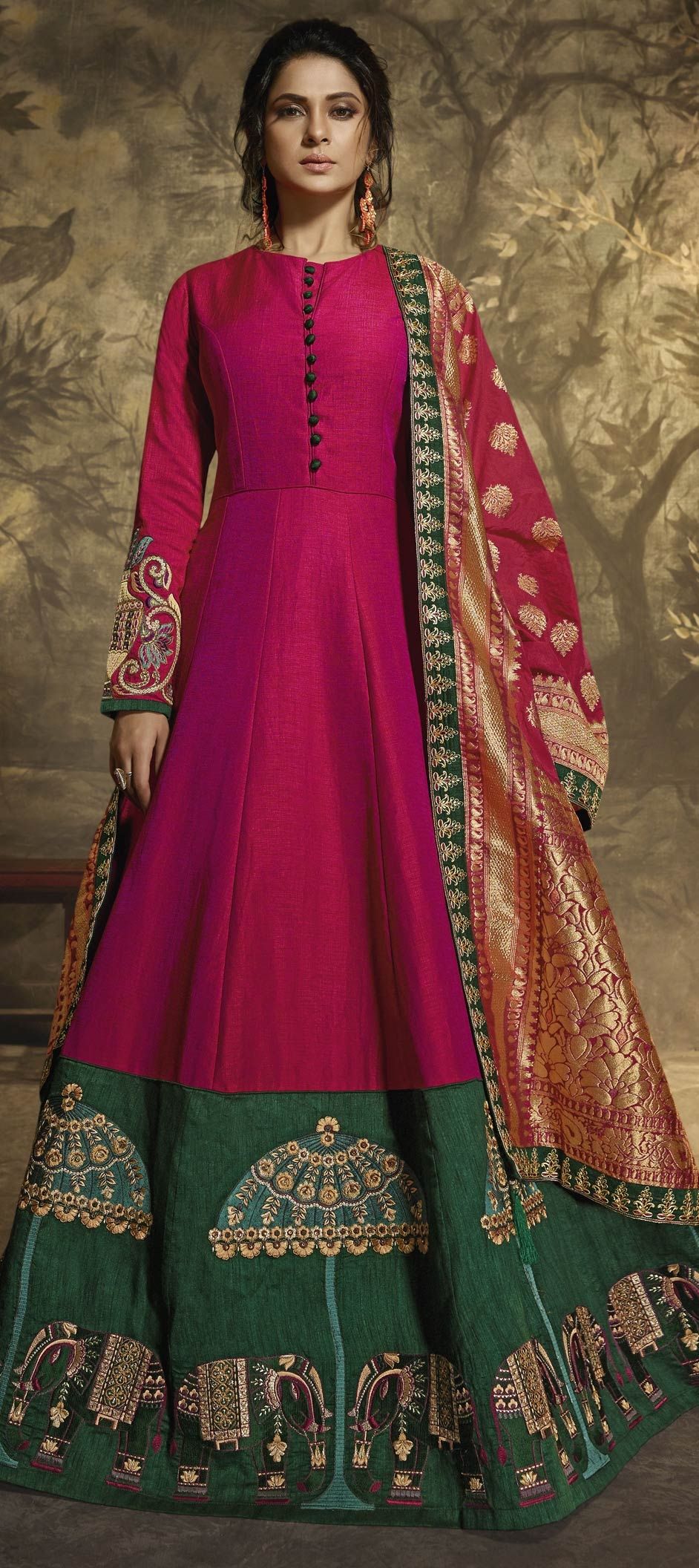Green, Pink and Majenta color Salwar Kameez in Silk, Two Ton Silk fabric with Embroidered, Resham, Stone, Thread, Zari work