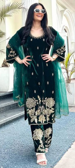 Green color Salwar Kameez in Velvet fabric with Embroidered, Sequence work