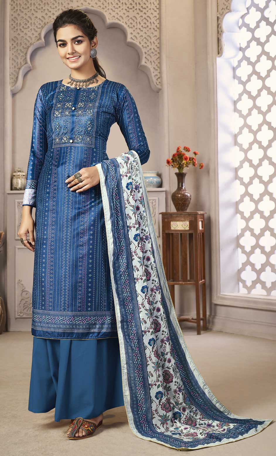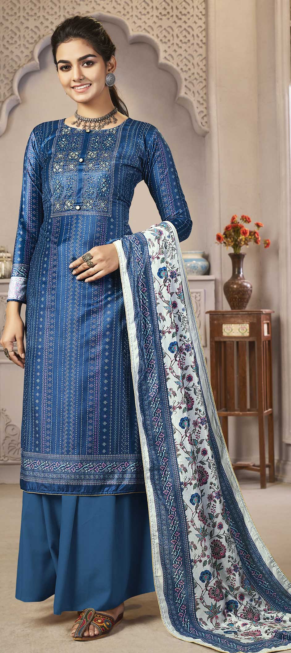 Blue color Salwar Kameez in Velvet fabric with Digital Print, Sequence, Thread work