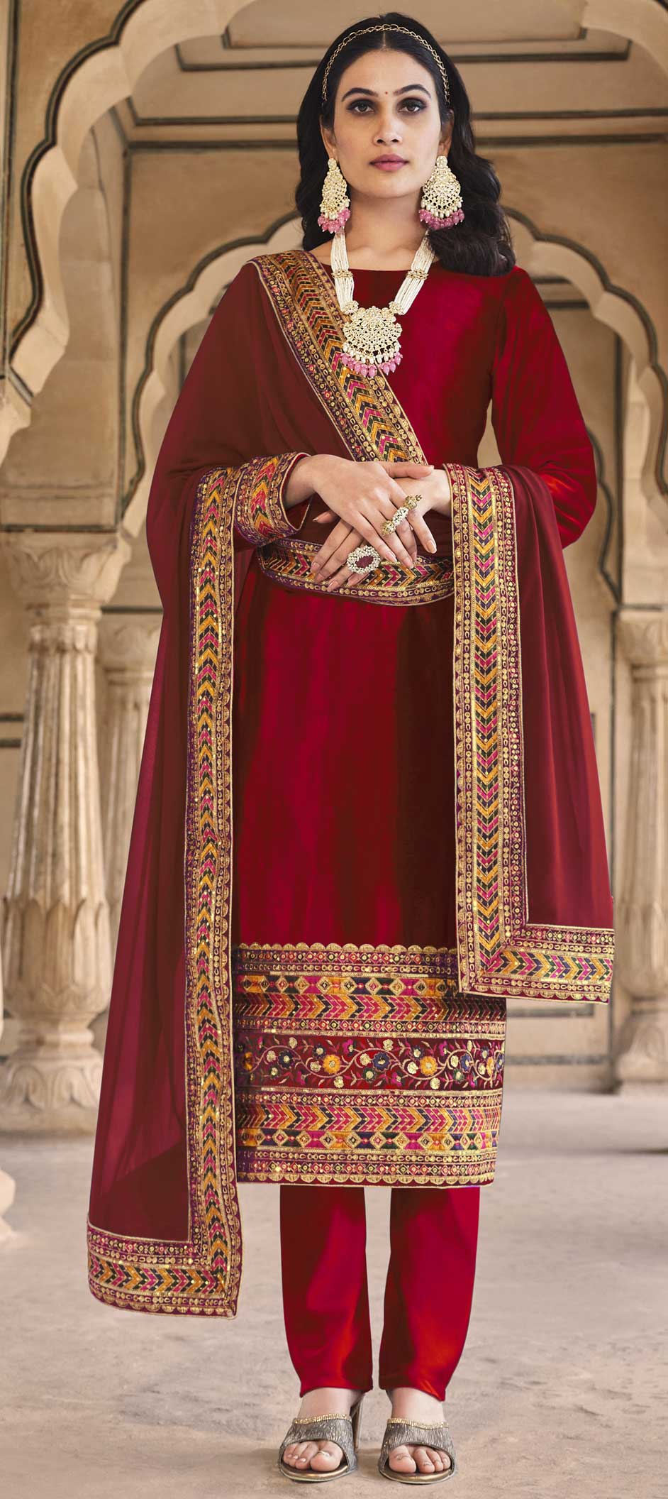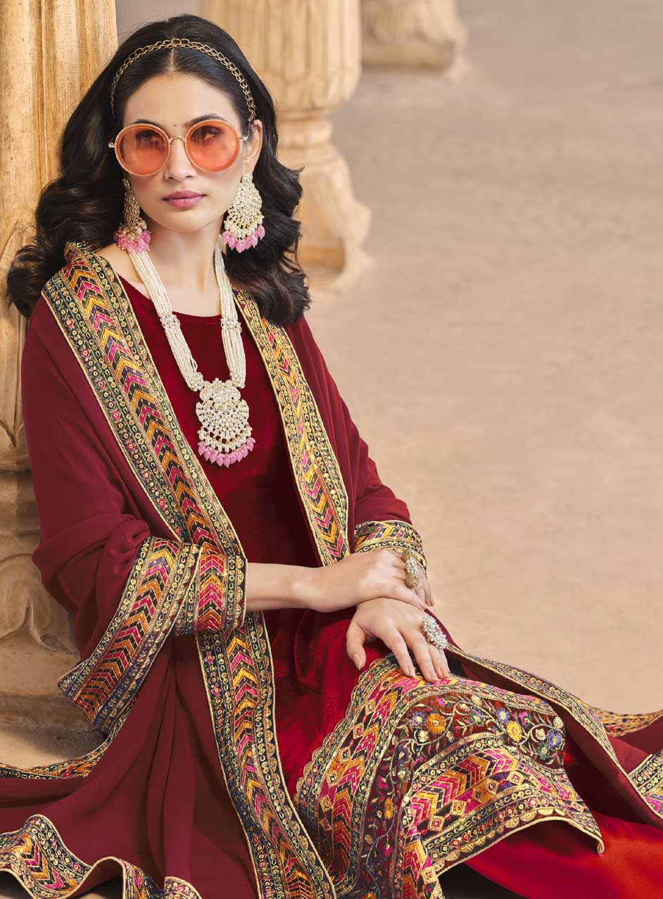 Red and Maroon color Salwar Kameez in Velvet fabric with Lace, Sequence work