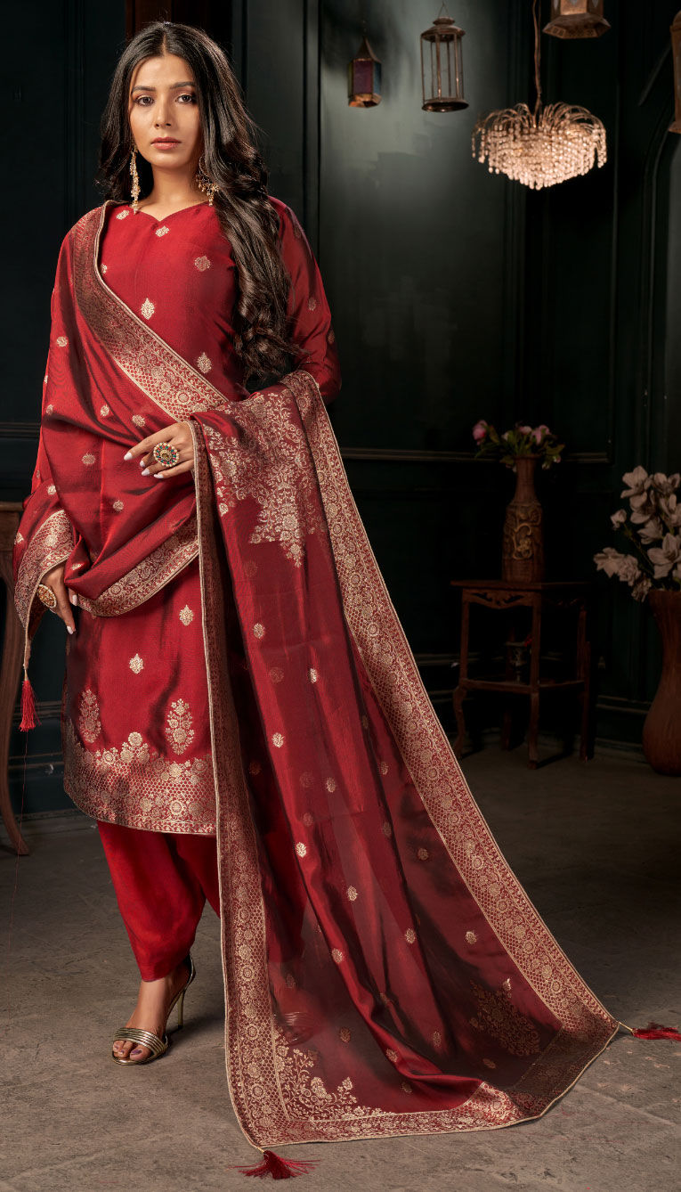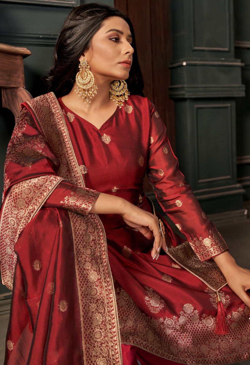 Red and Maroon color Salwar Kameez in Viscose fabric with Weaving work