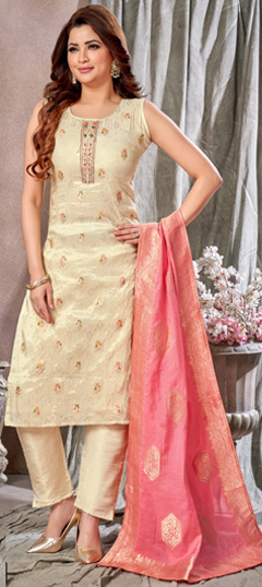 White and Off White color Salwar Kameez in Chanderi Silk, Viscose fabric with Embroidered work