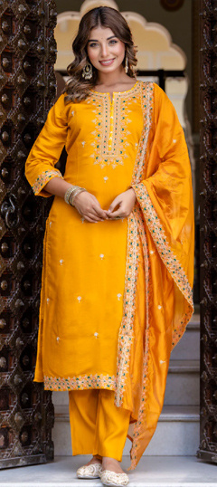 Yellow color Salwar Kameez in Chanderi Silk fabric with Embroidered work