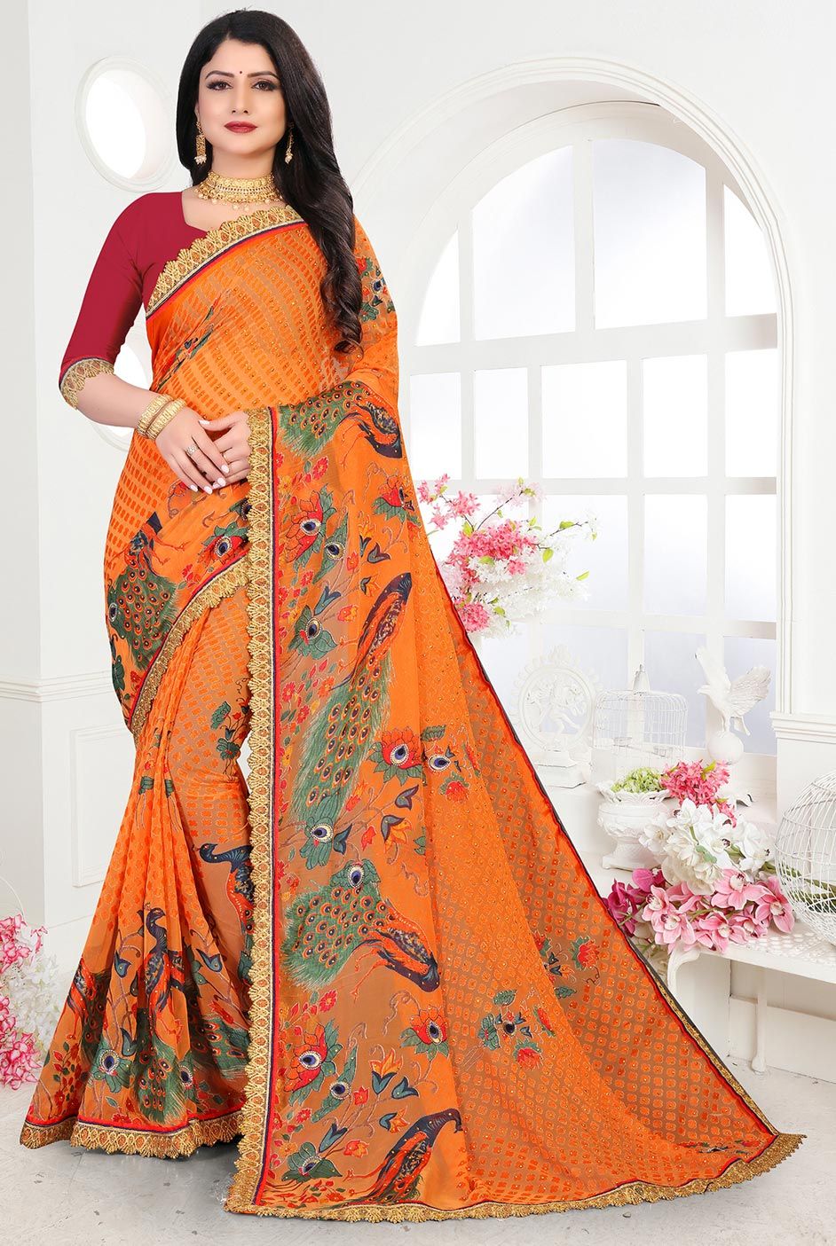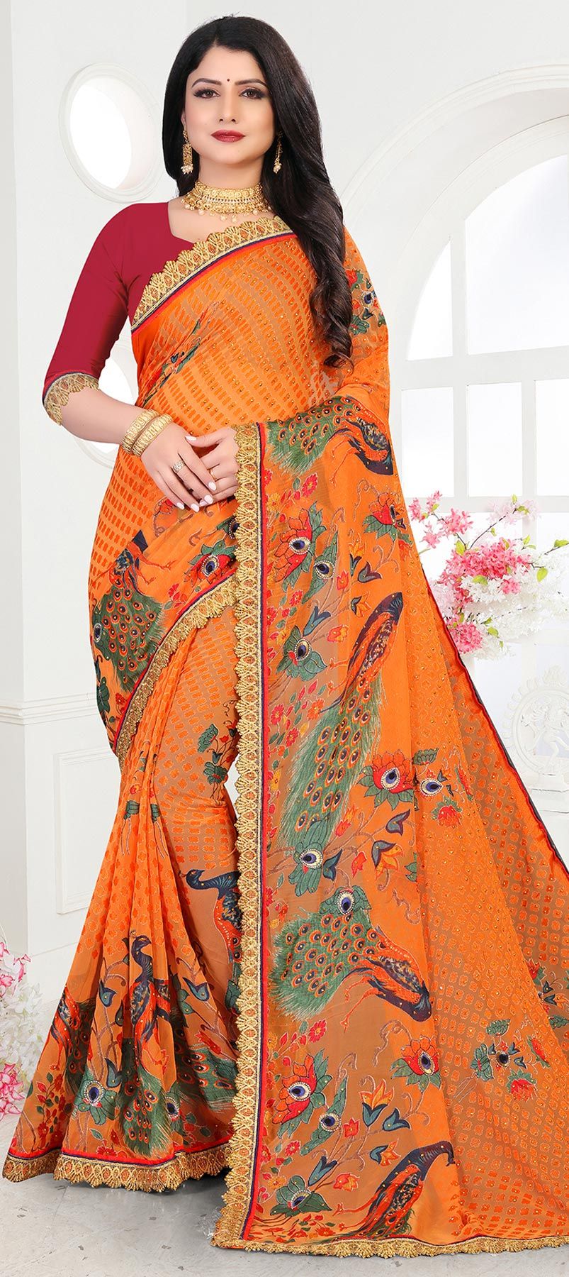 Orange color Saree in Art Silk, Silk fabric with Embroidered, Stone, Thread work