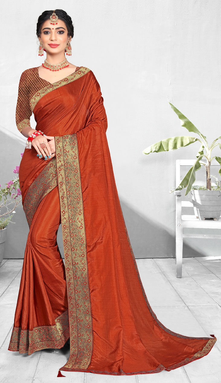 Orange color Saree in Art Silk, Silk fabric with Lace work