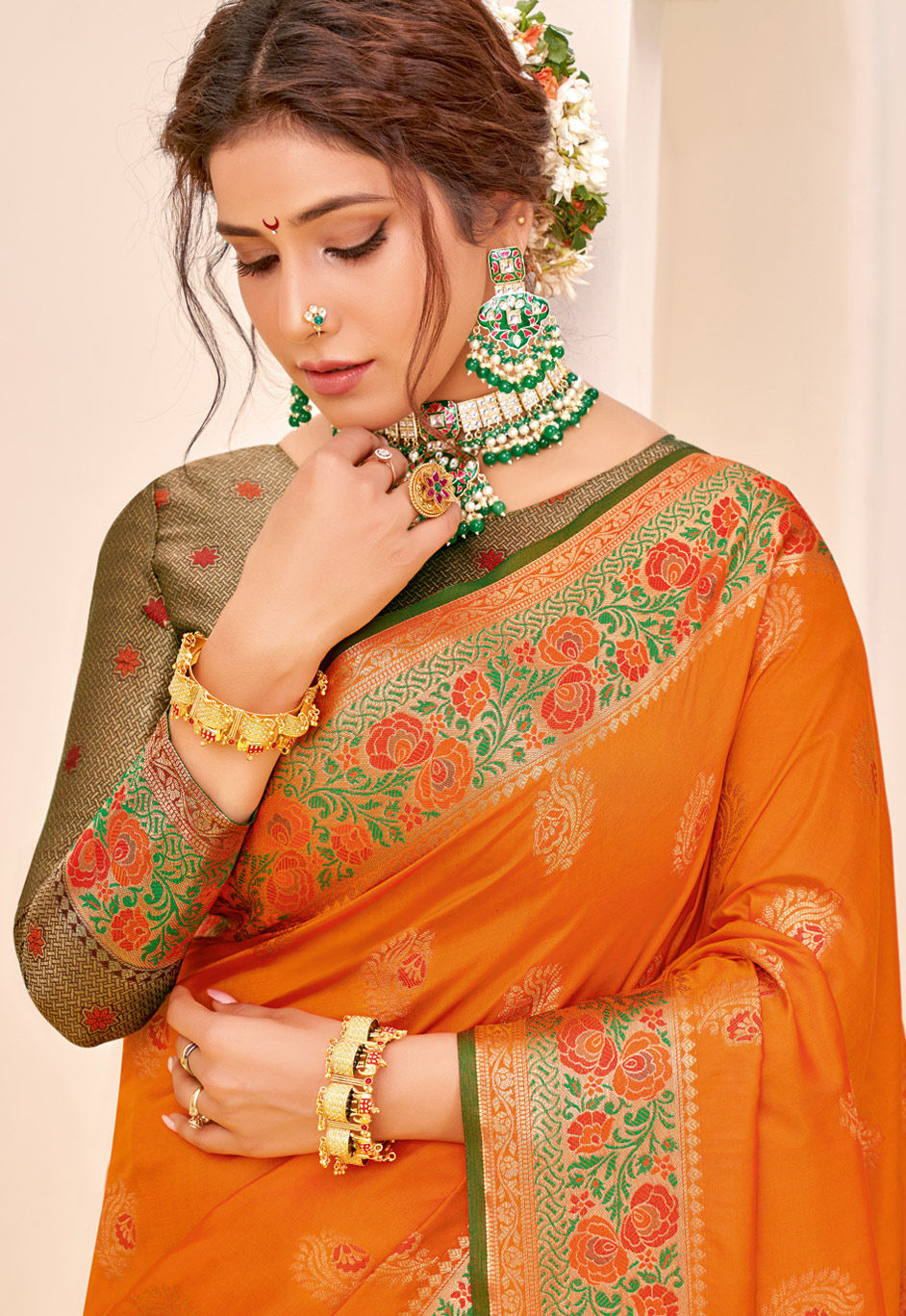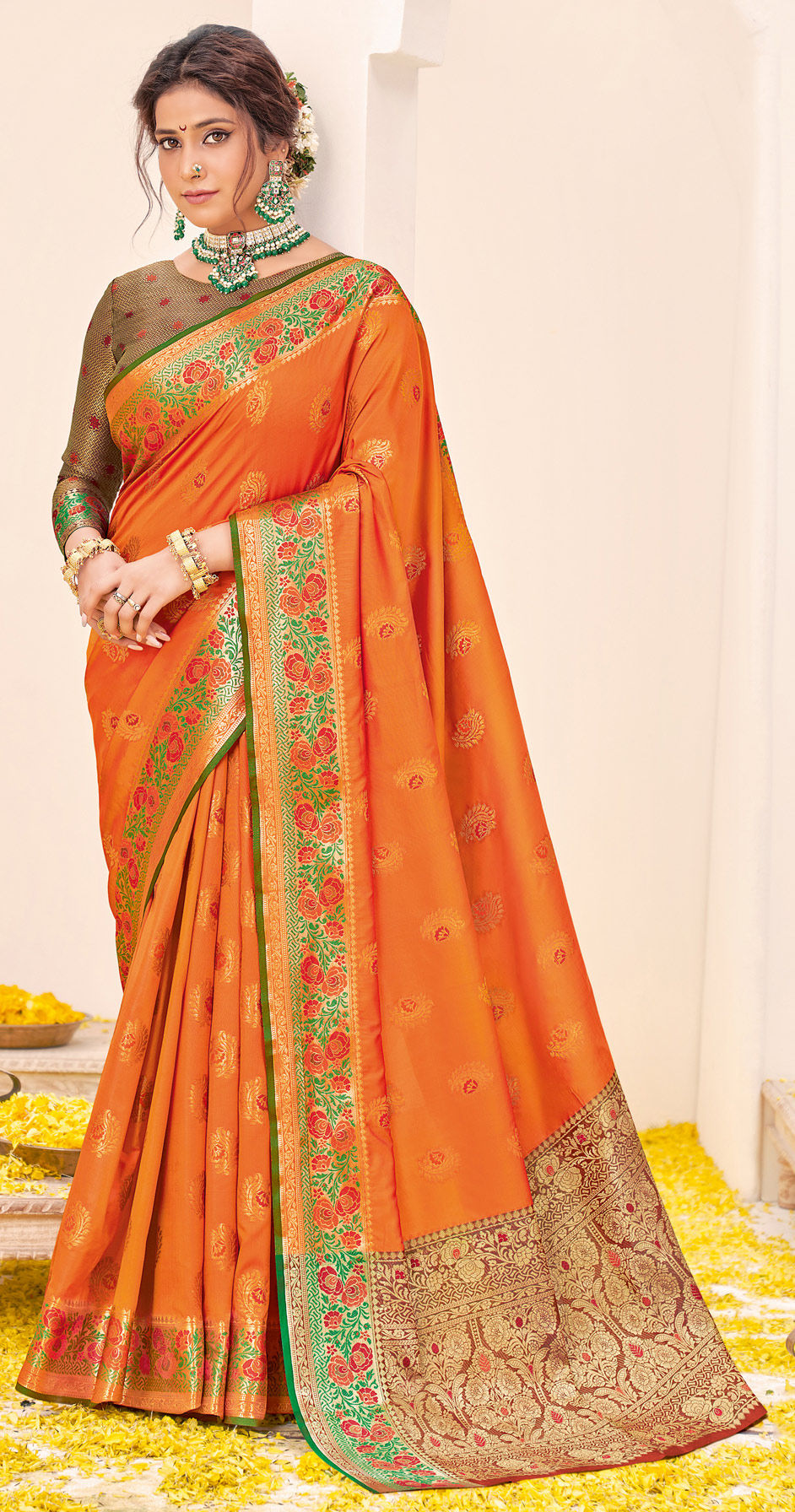 Orange color Saree in Art Silk, Silk fabric with Weaving work