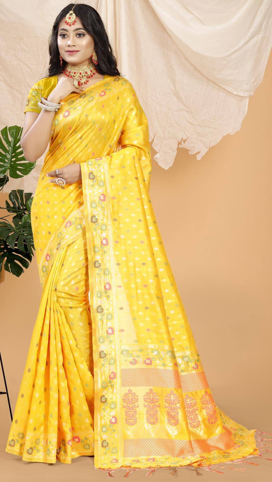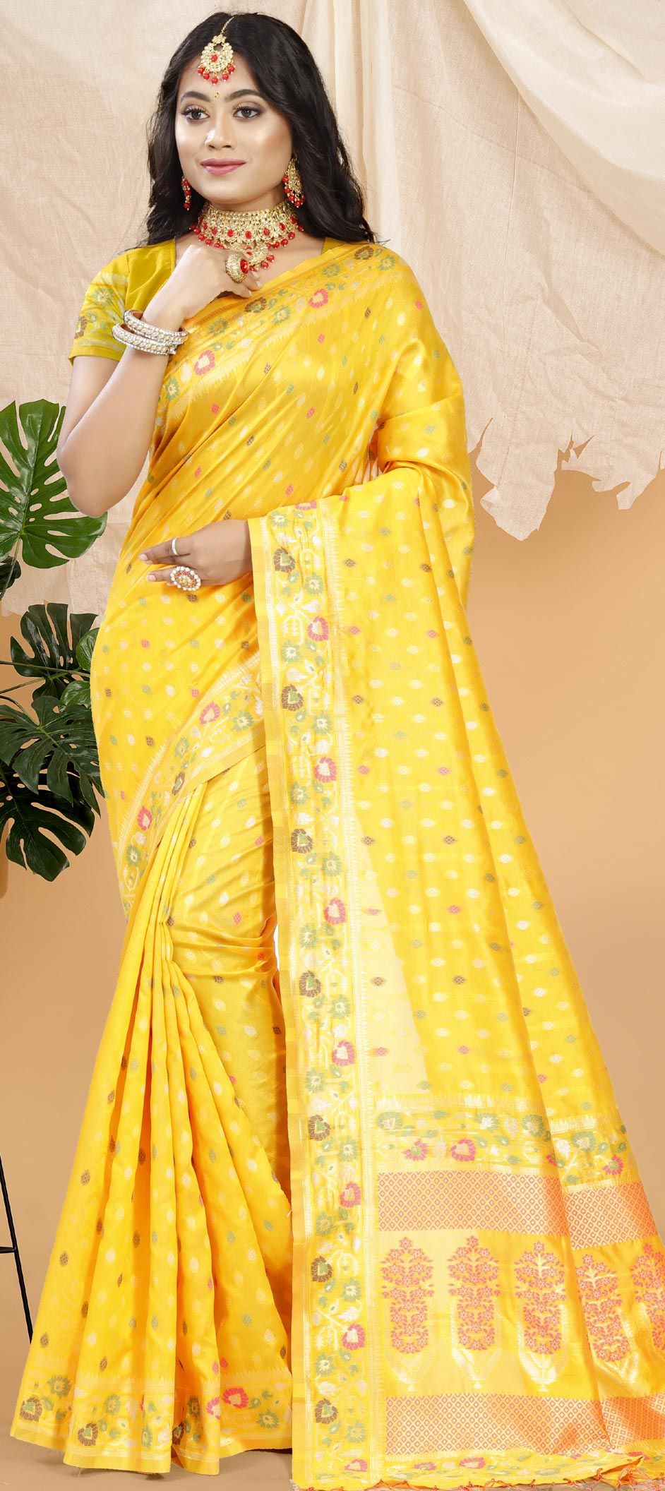 Yellow color Saree in Art Silk, Silk fabric with Weaving work