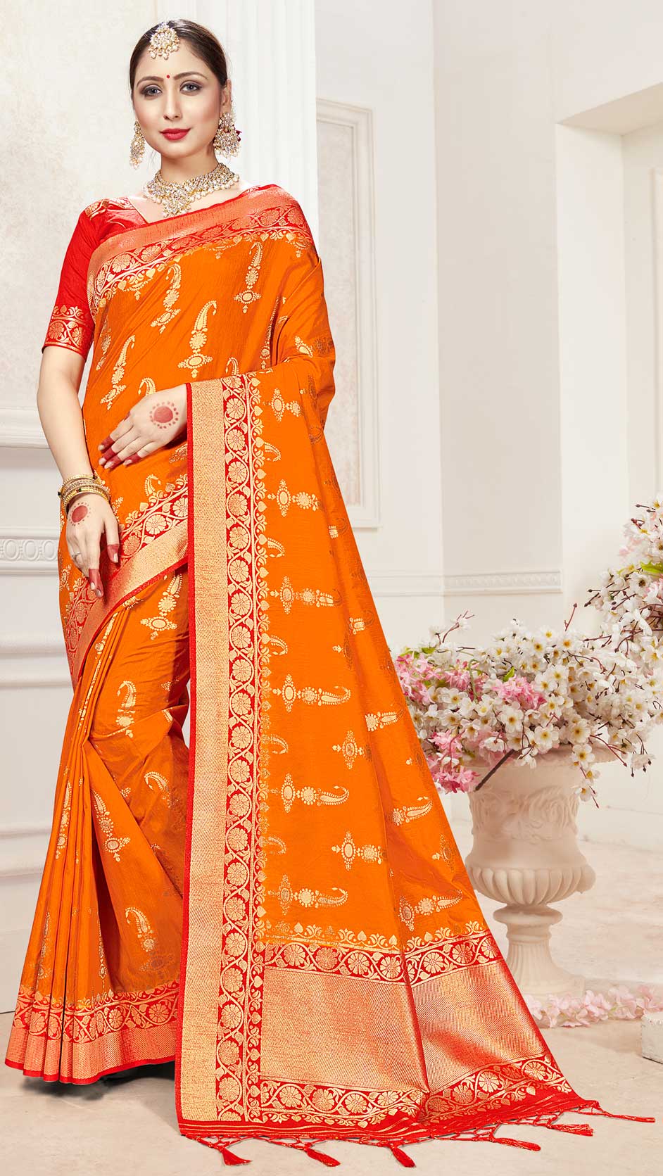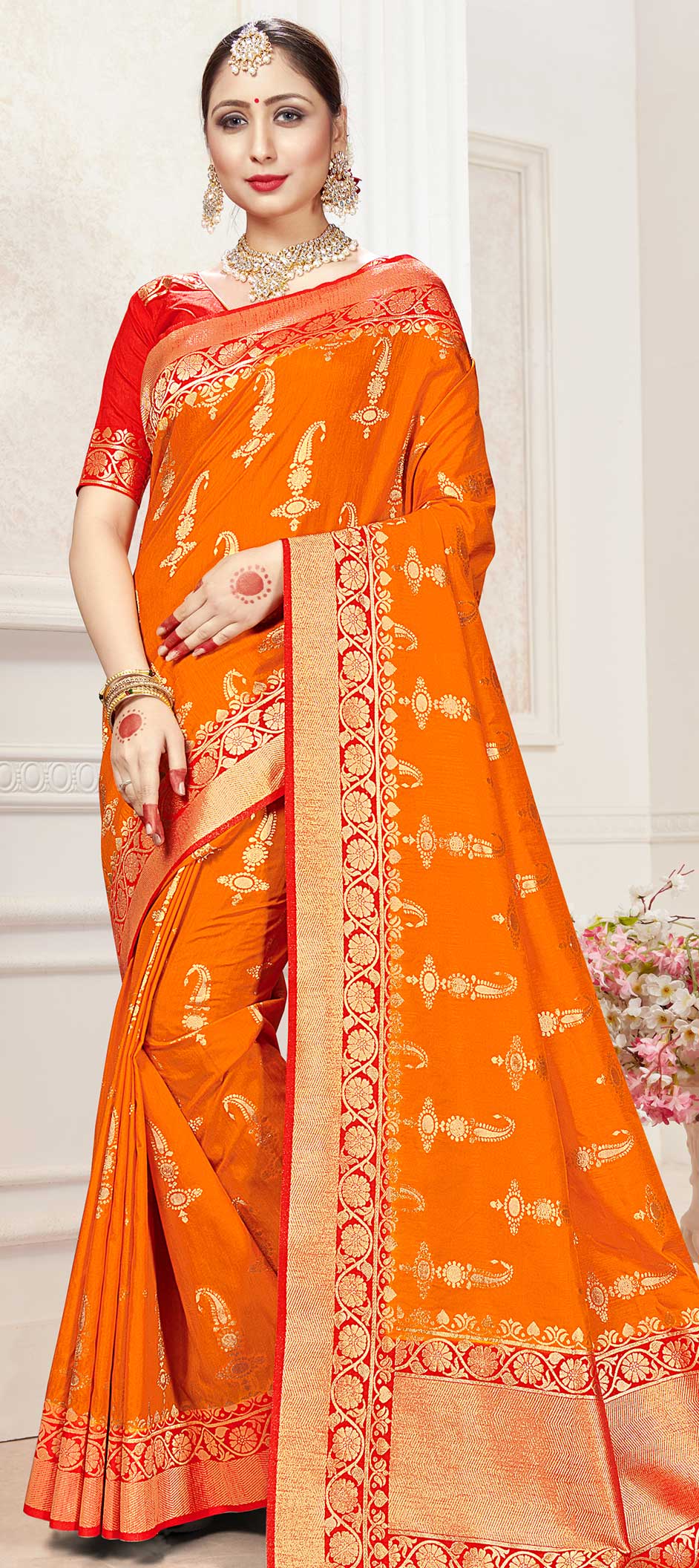 Orange color Saree in Banarasi Silk, Silk fabric with Weaving work