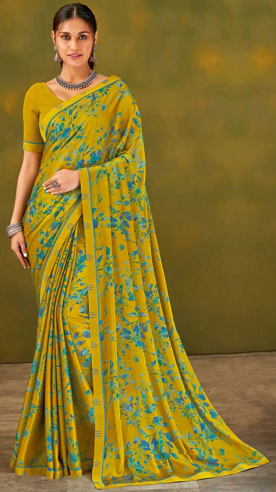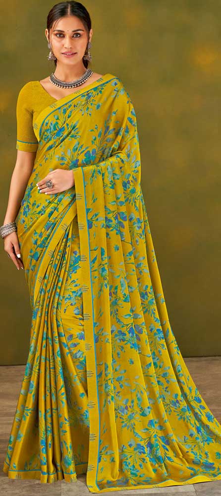 Yellow color Saree in Chiffon fabric with Floral, Printed work