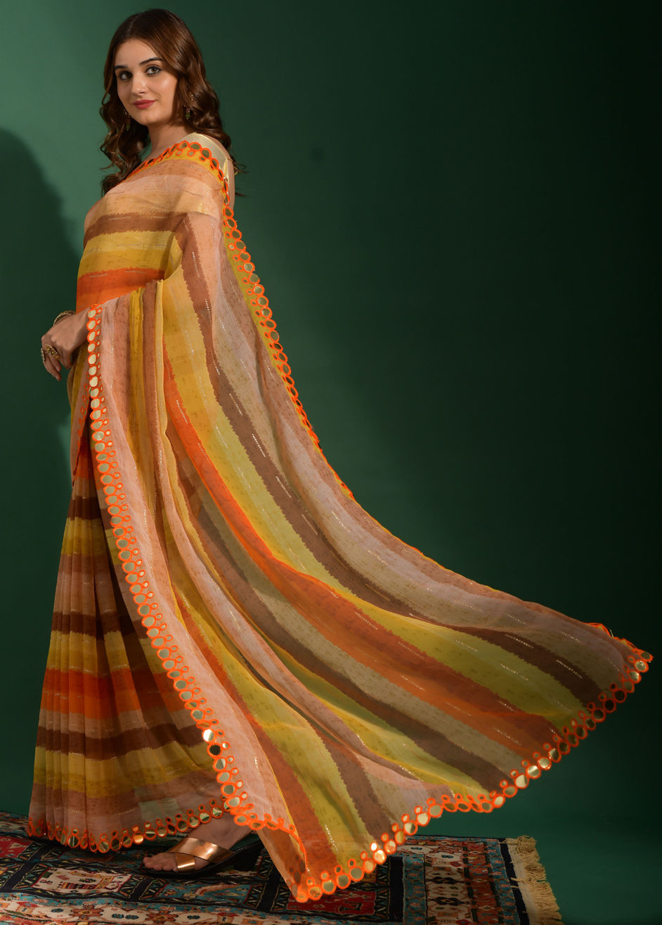 Orange color Saree in Chiffon fabric with Embroidered, Lehariya, Mirror, Printed work