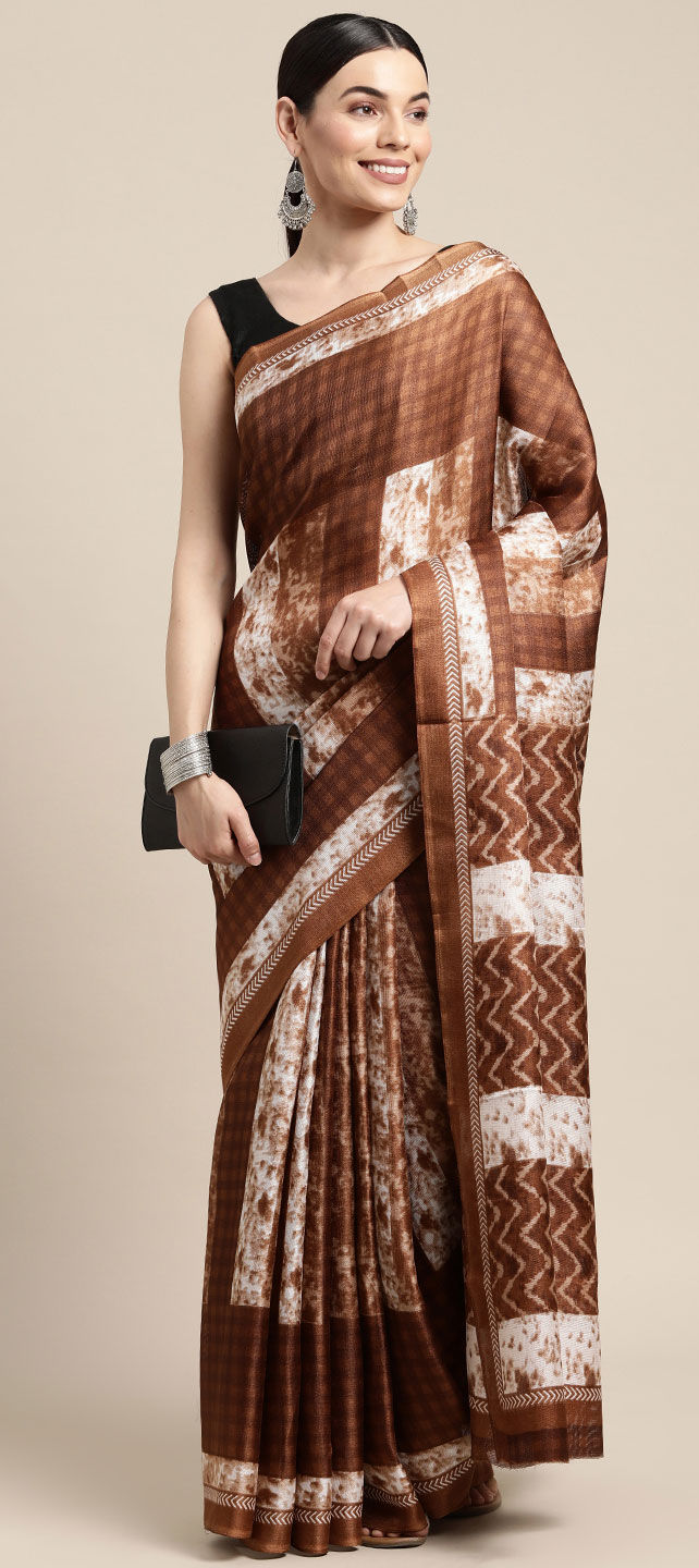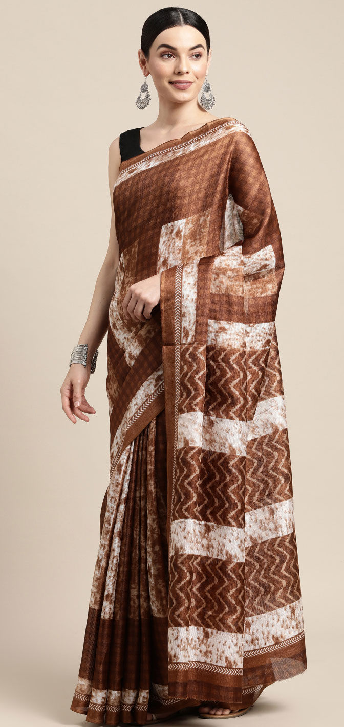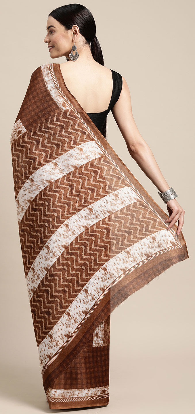 Beige and Brown color Saree in Cotton fabric with Printed work