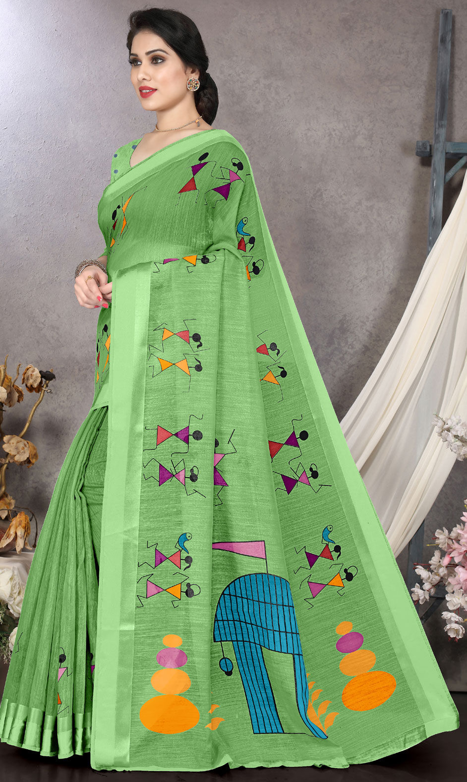 Green color Saree in Cotton fabric with Printed work