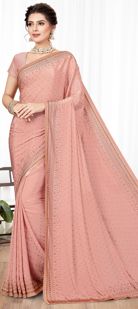 Pink and Majenta color Saree in Crepe Silk, Silk fabric with Stone work