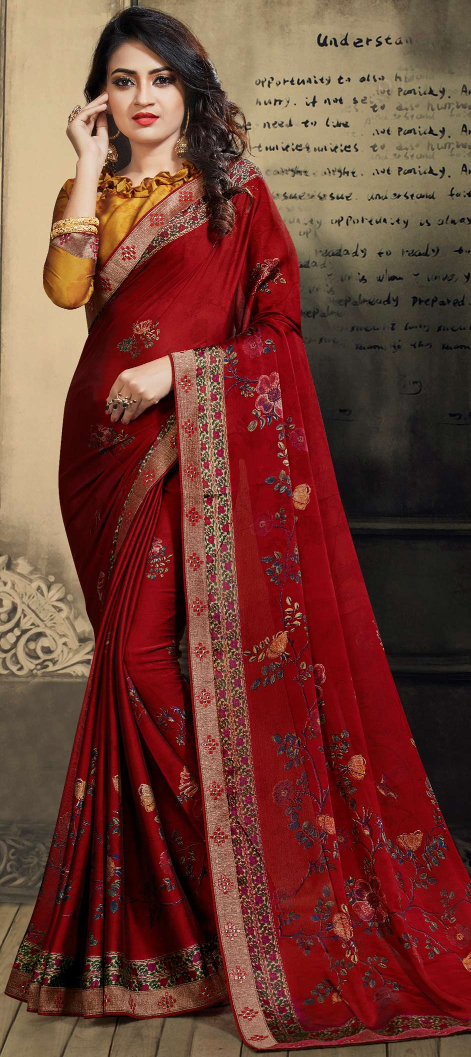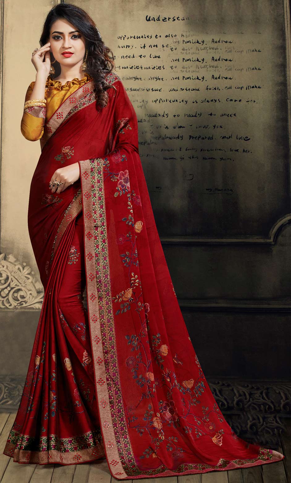 Red and Maroon color Saree in Faux Chiffon fabric with Printed work