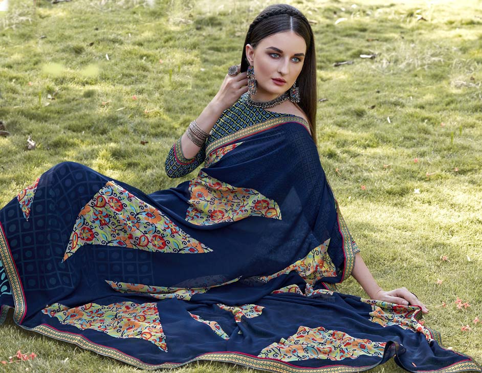 Blue color Saree in Georgette fabric with Printed work