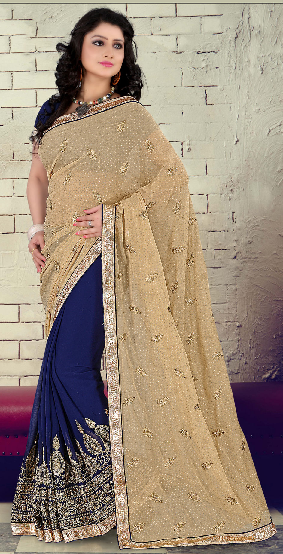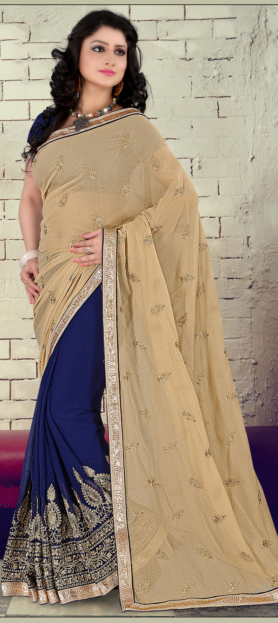 Beige and Brown, Blue color Saree in Faux Chiffon, Faux Georgette fabric with Embroidered, Lace, Resham, Stone, Zari work