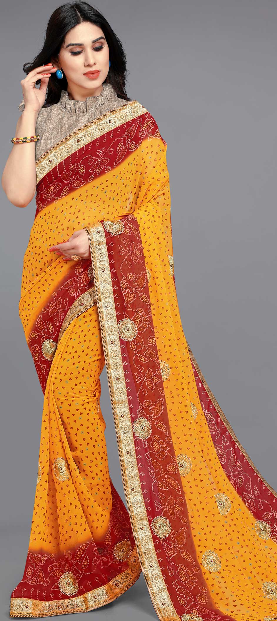 Yellow color Saree in Faux Georgette fabric with Bandhej, Border, Embroidered, Printed work