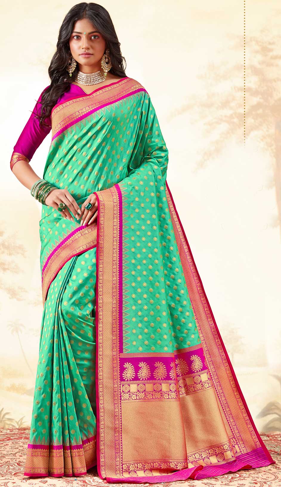 Green color Saree in Gadwal silk, Silk fabric with Weaving work