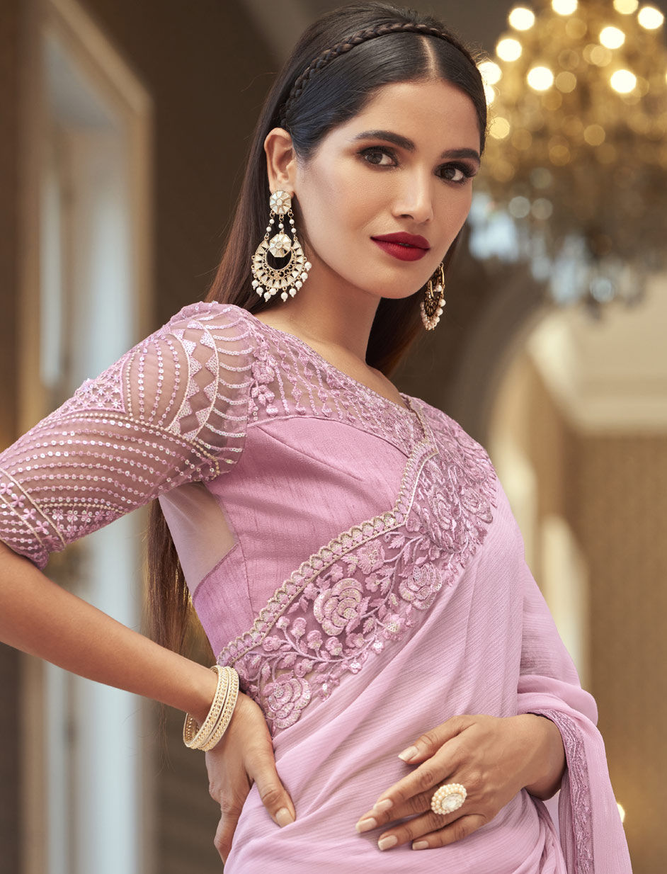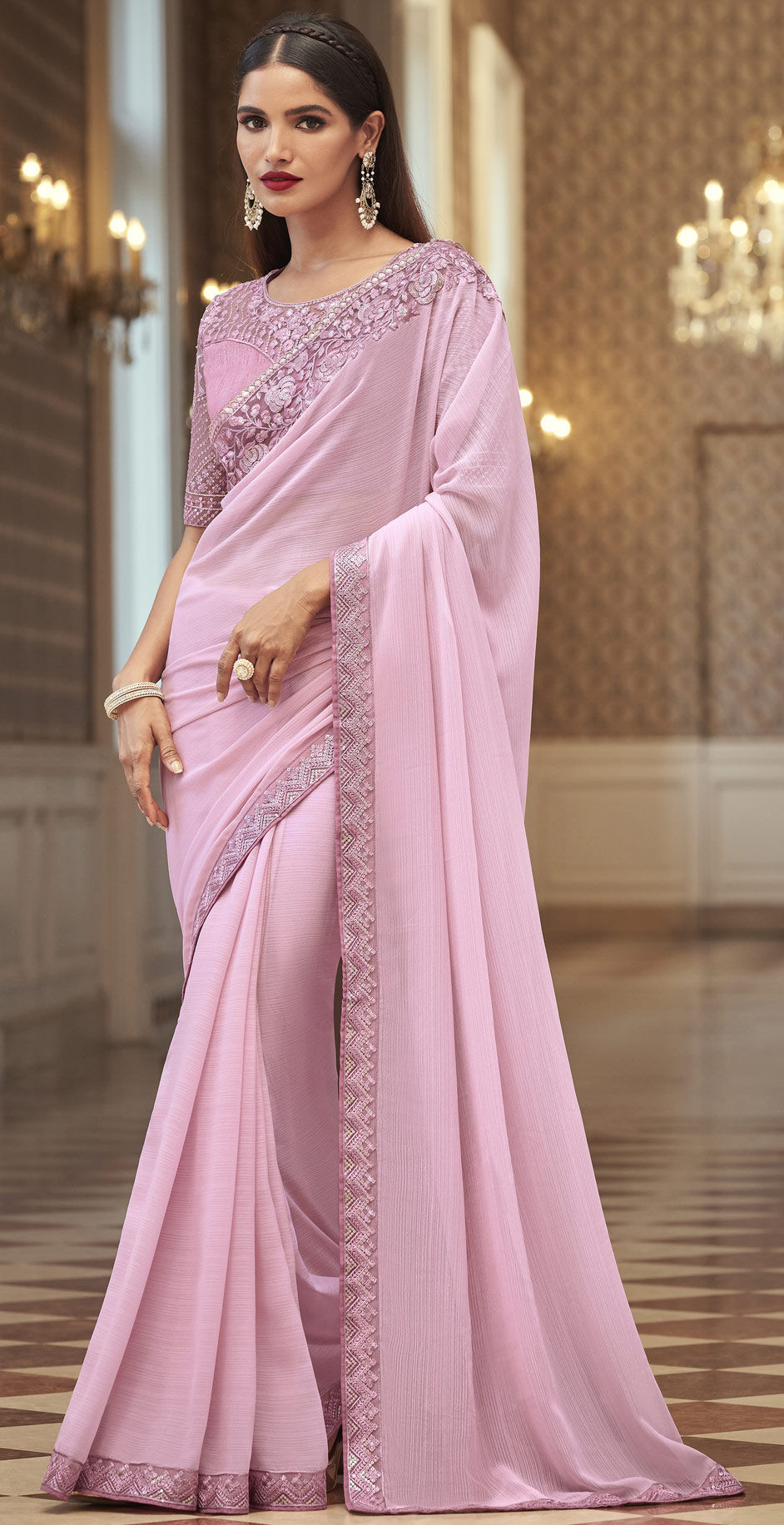 Pink and Majenta color Saree in Georgette fabric with Border, Embroidered, Sequence work