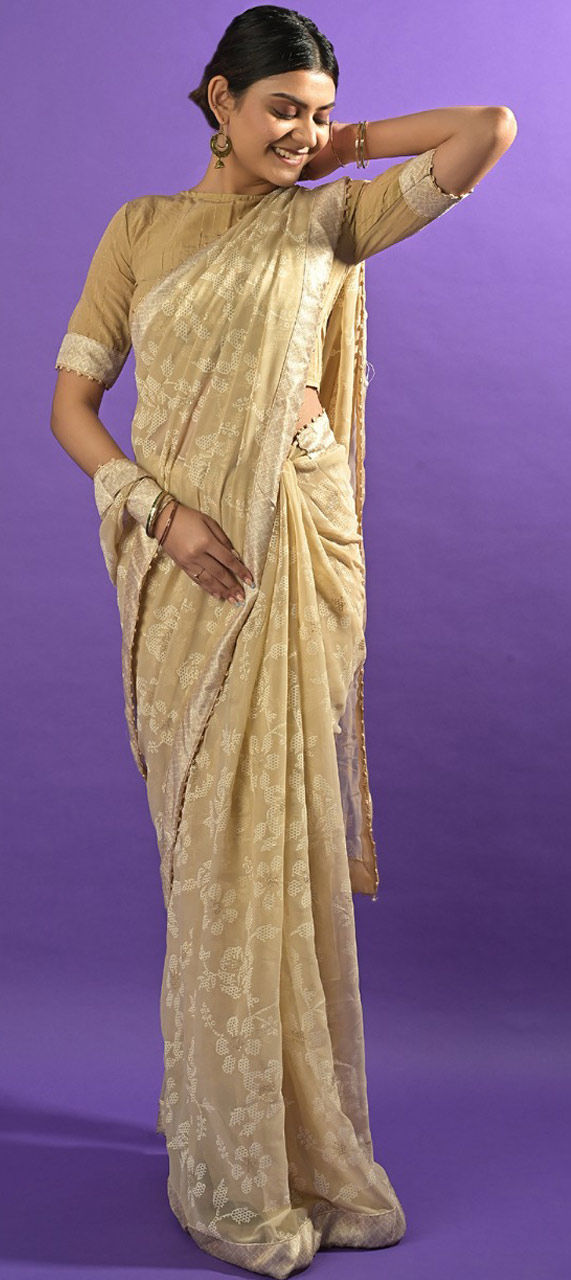 Beige and Brown color Saree in Georgette fabric with Digital Print work