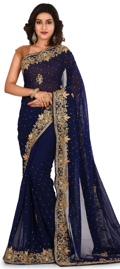 Blue color Saree in Georgette fabric with Bugle Beads, Cut Dana, Thread work