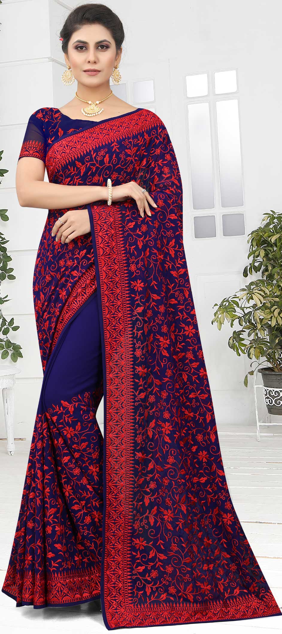 Georgette Festive Saree in Red and Maroon with Embroidered work