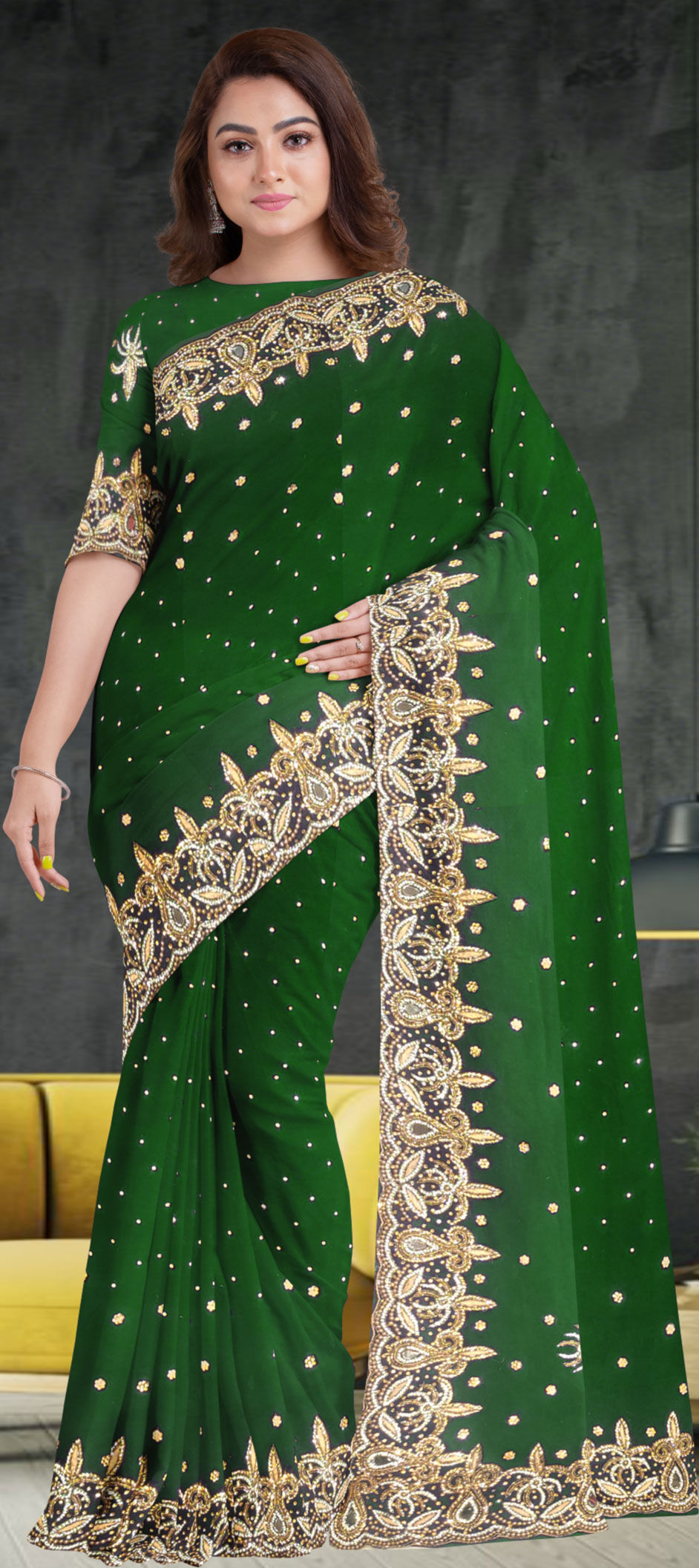 Green color Saree in Georgette fabric with Stone, Thread work
