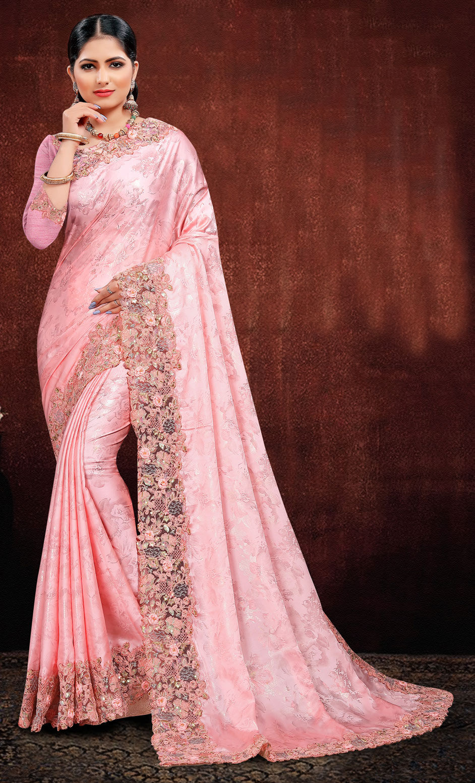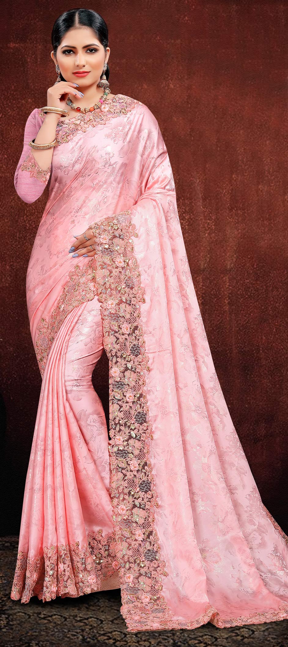 Pink and Majenta color Saree in Georgette, Satin Silk fabric with Digital Print, Embroidered, Floral, Resham, Stone, Thread work