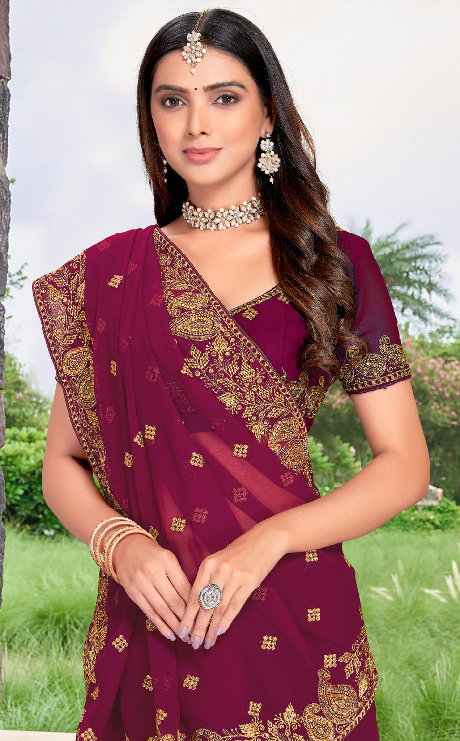 Red and Maroon color Saree in Georgette fabric with Embroidered, Stone, Thread, Zari work