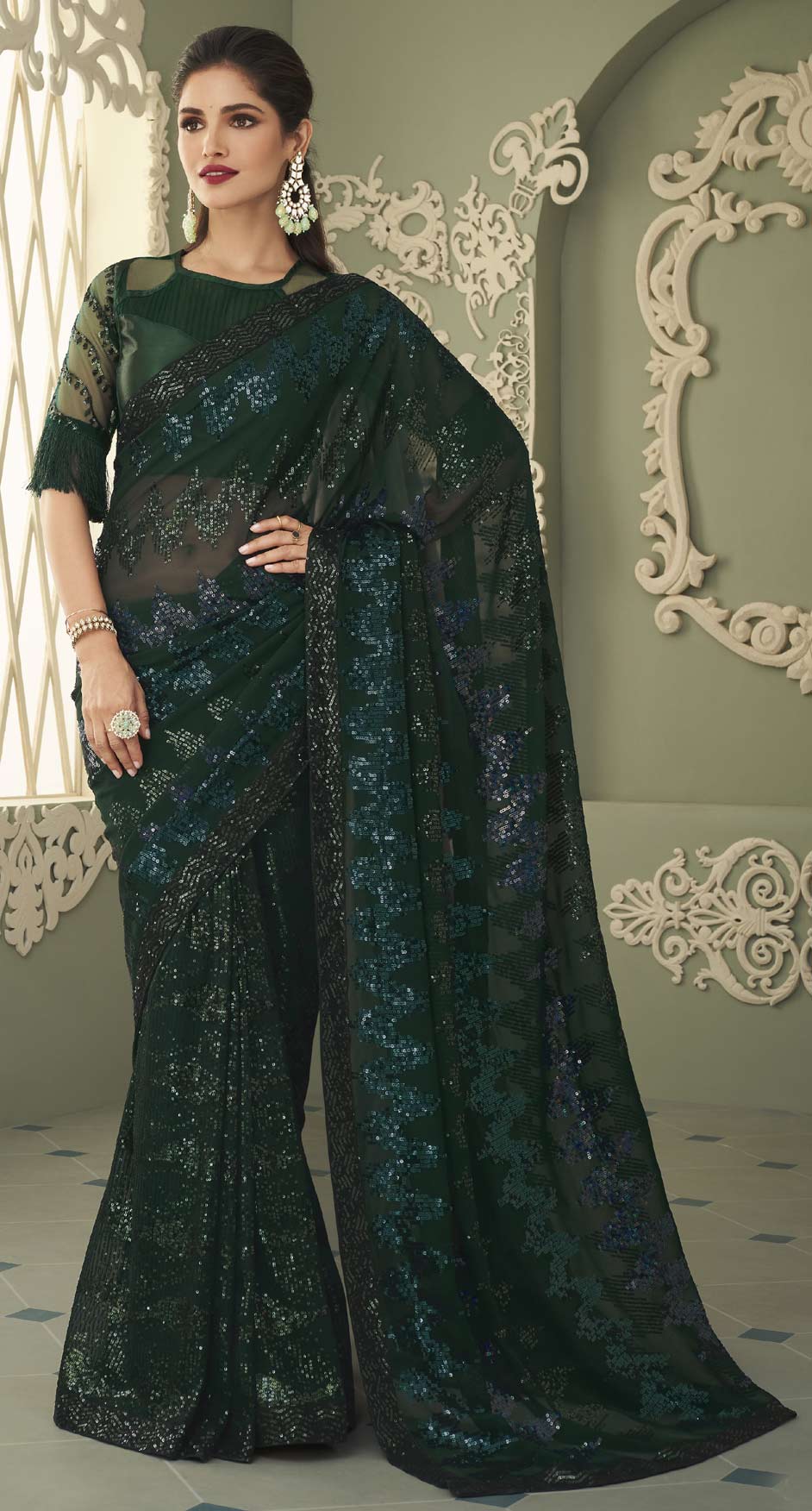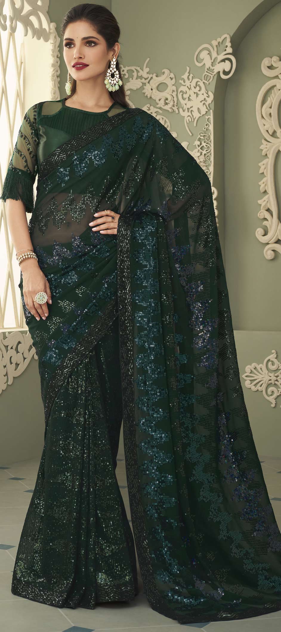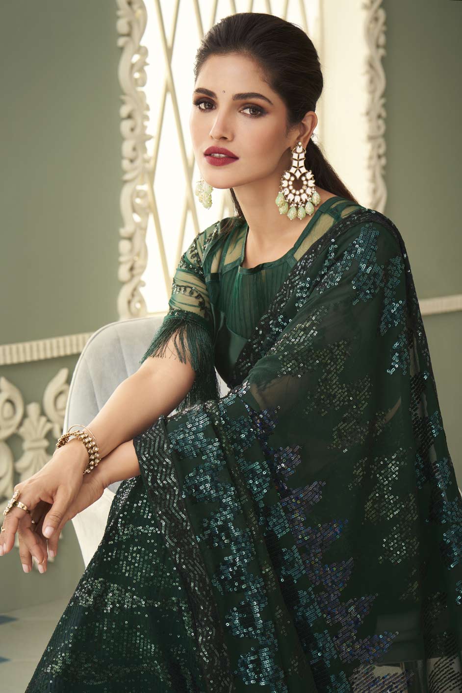 Green color Saree in Georgette fabric with Sequence work