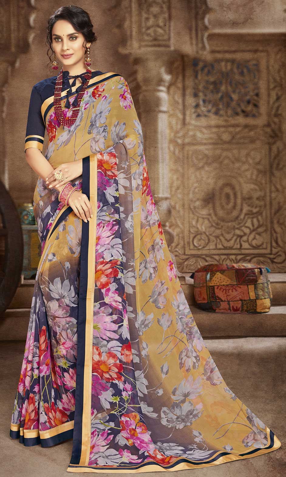 Yellow color Saree in Georgette fabric with Floral, Printed work