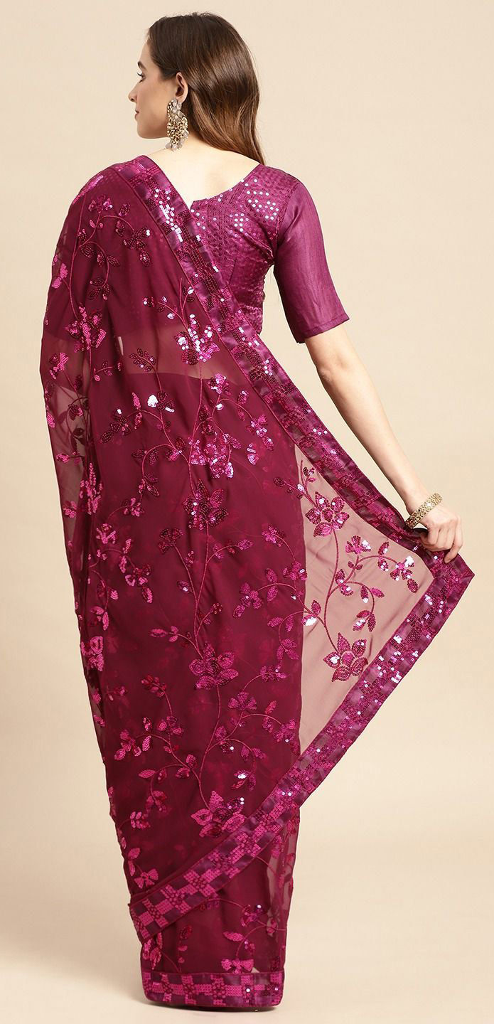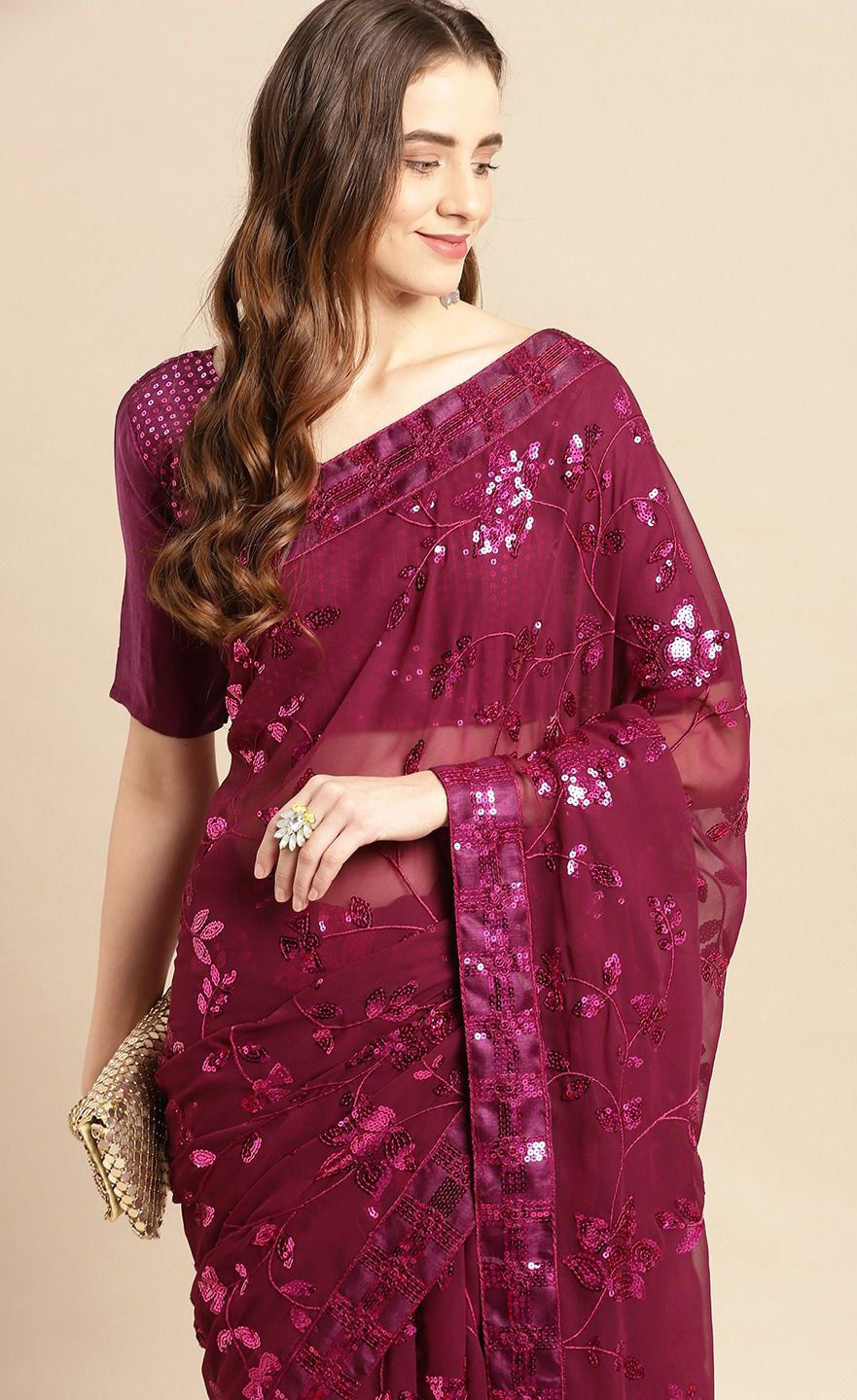 Red and Maroon color Saree in Georgette fabric with Embroidered, Sequence, Thread work