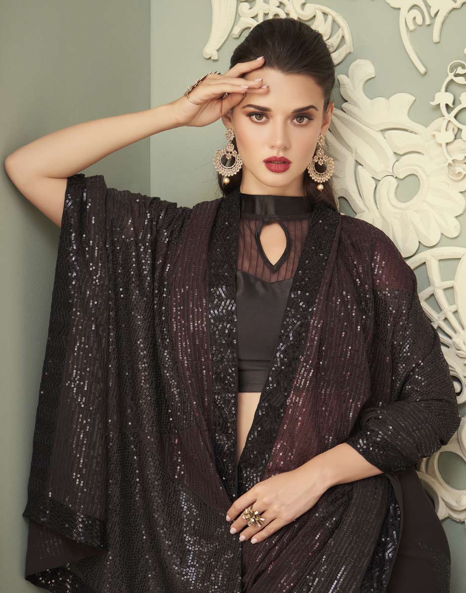 Beige and Brown color Saree in Georgette fabric with Sequence work