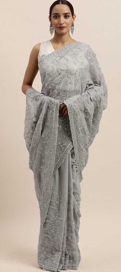 Black and Grey color Saree in Georgette fabric with Embroidered, Thread, Zari work