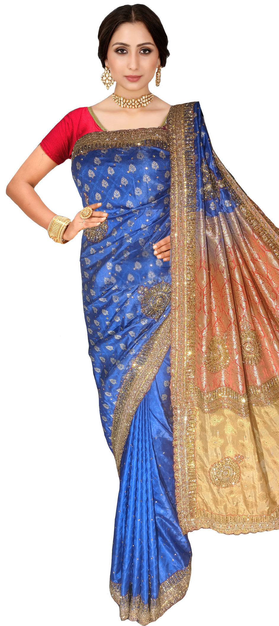 Blue color Saree in Kanchipuram Silk, Silk fabric with Stone, Weaving work