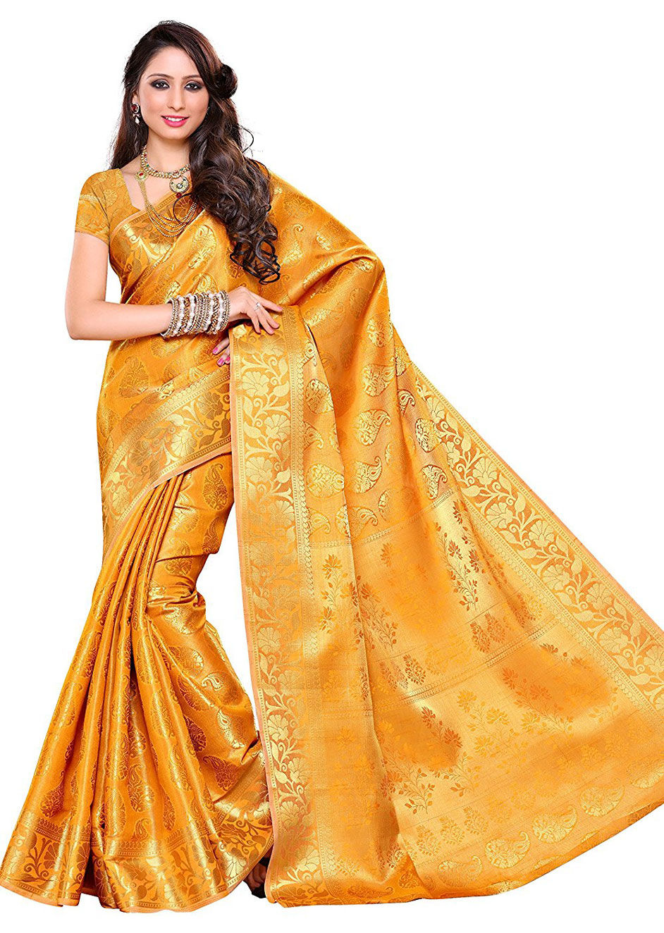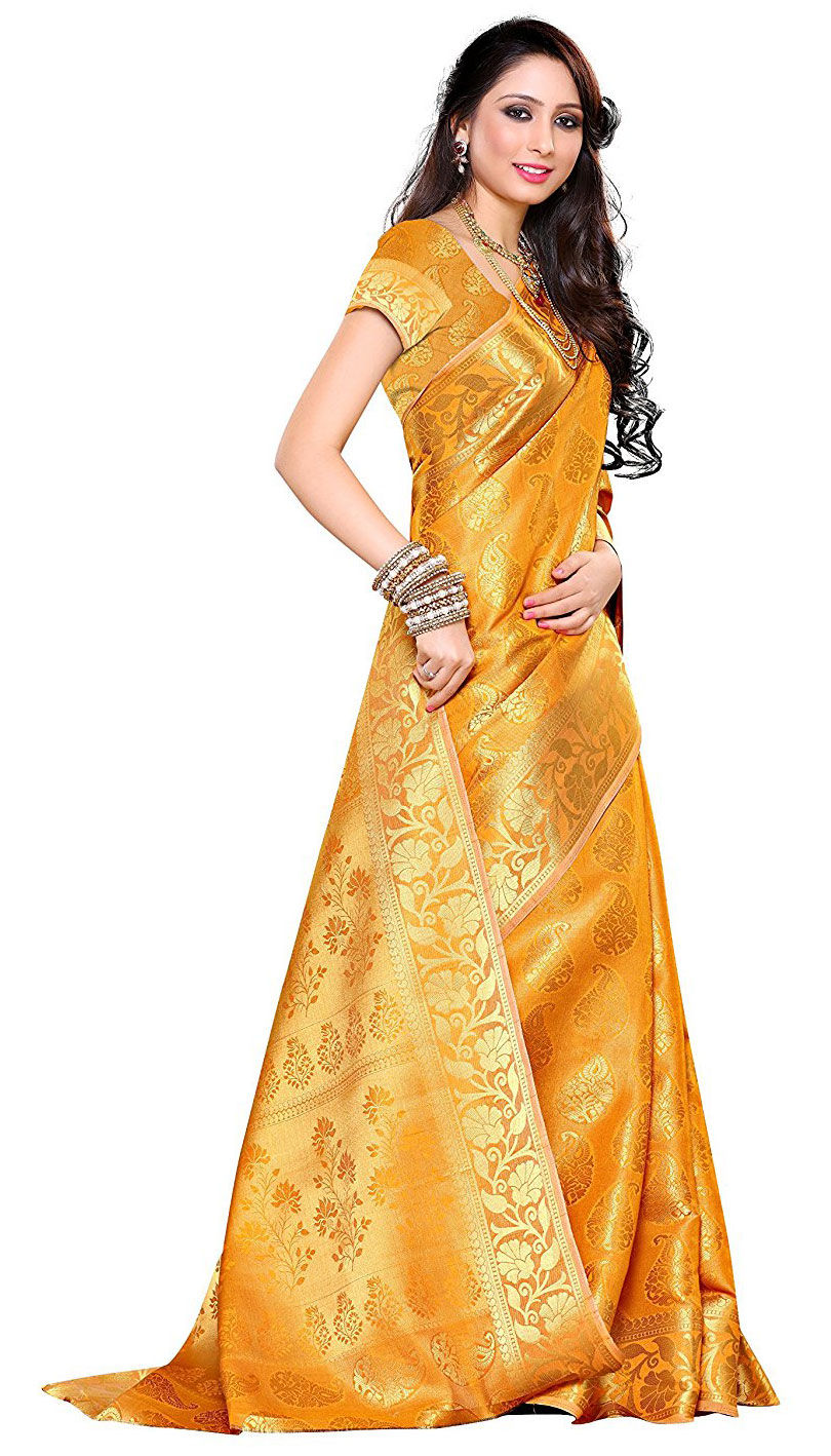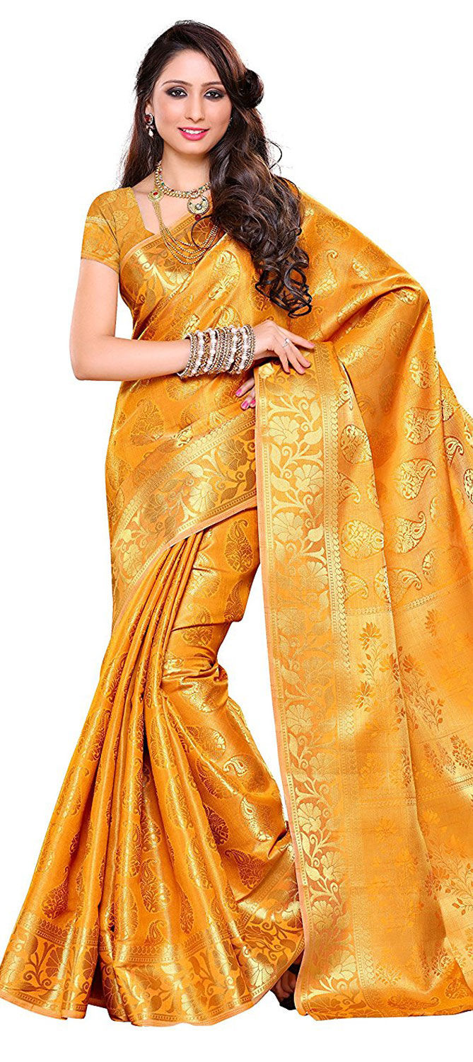 Gold color Saree in Kanchipuram Silk, Silk fabric with Weaving, Zari work