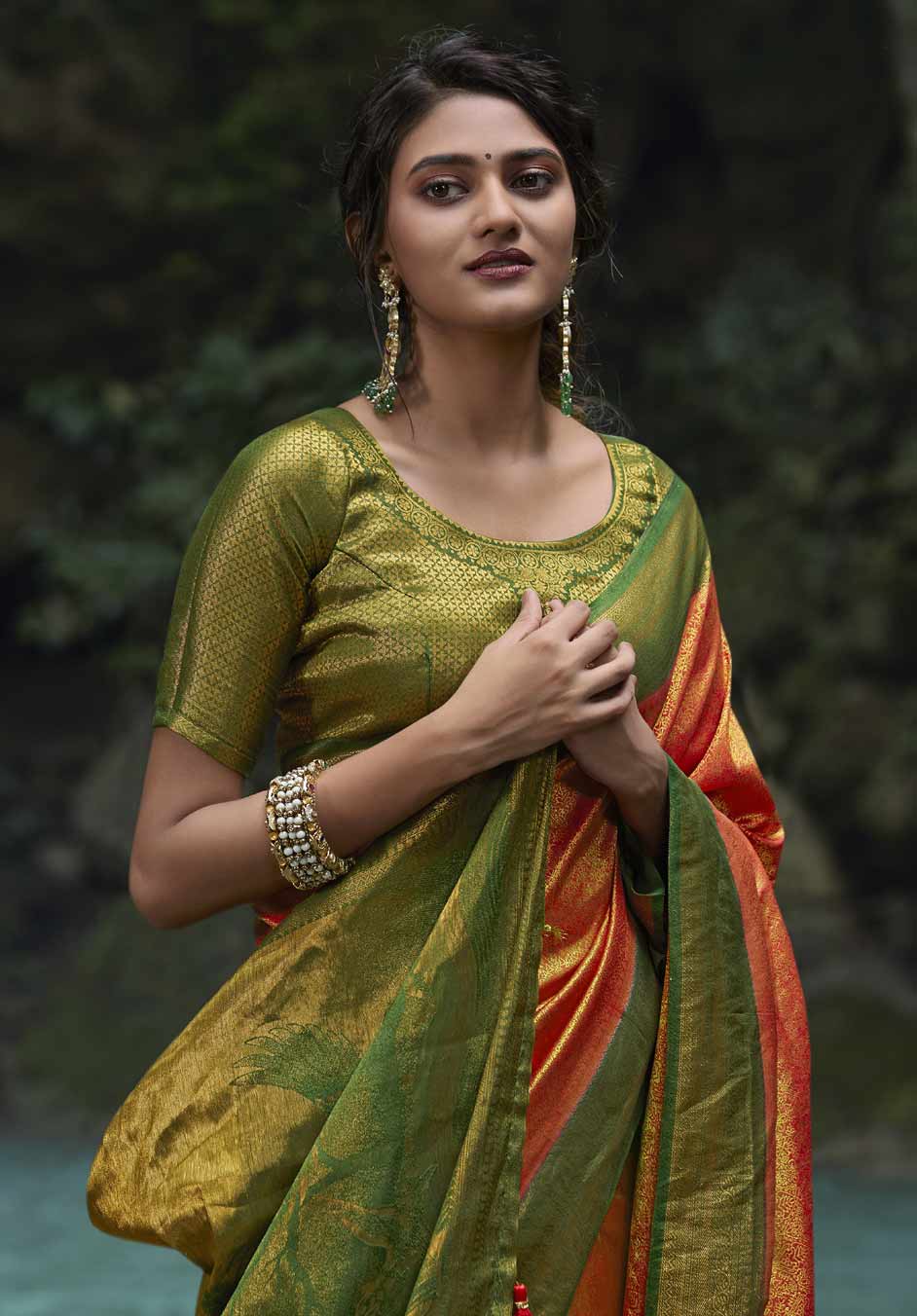 Red and Maroon color Saree in Kanjeevaram Silk, Silk fabric with Weaving work