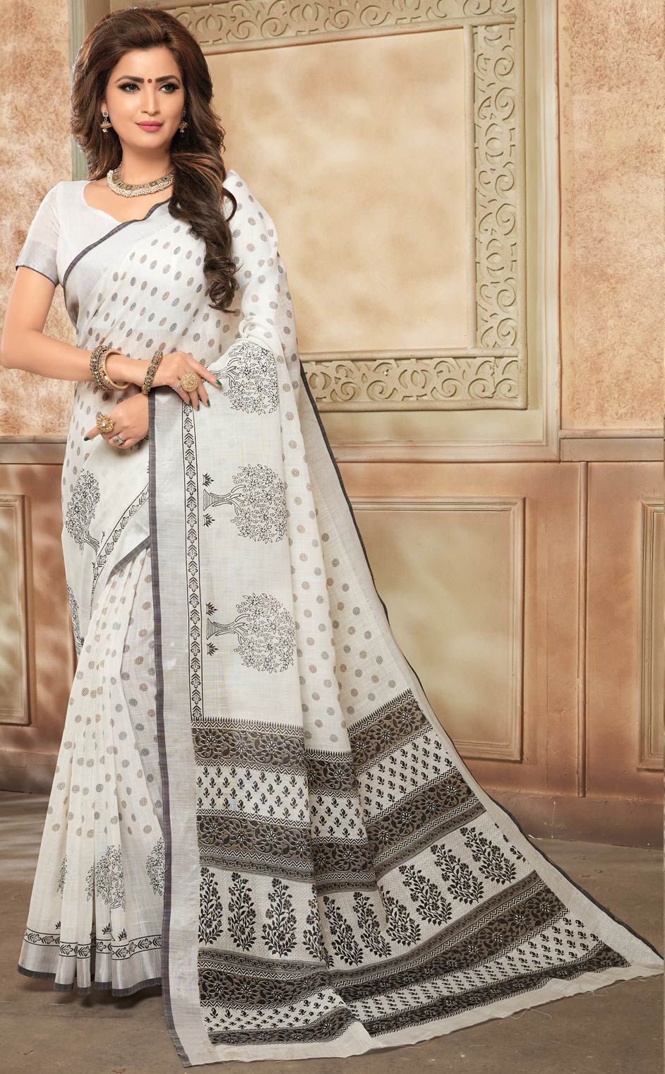 White and Off White color Saree in Linen fabric with Printed work
