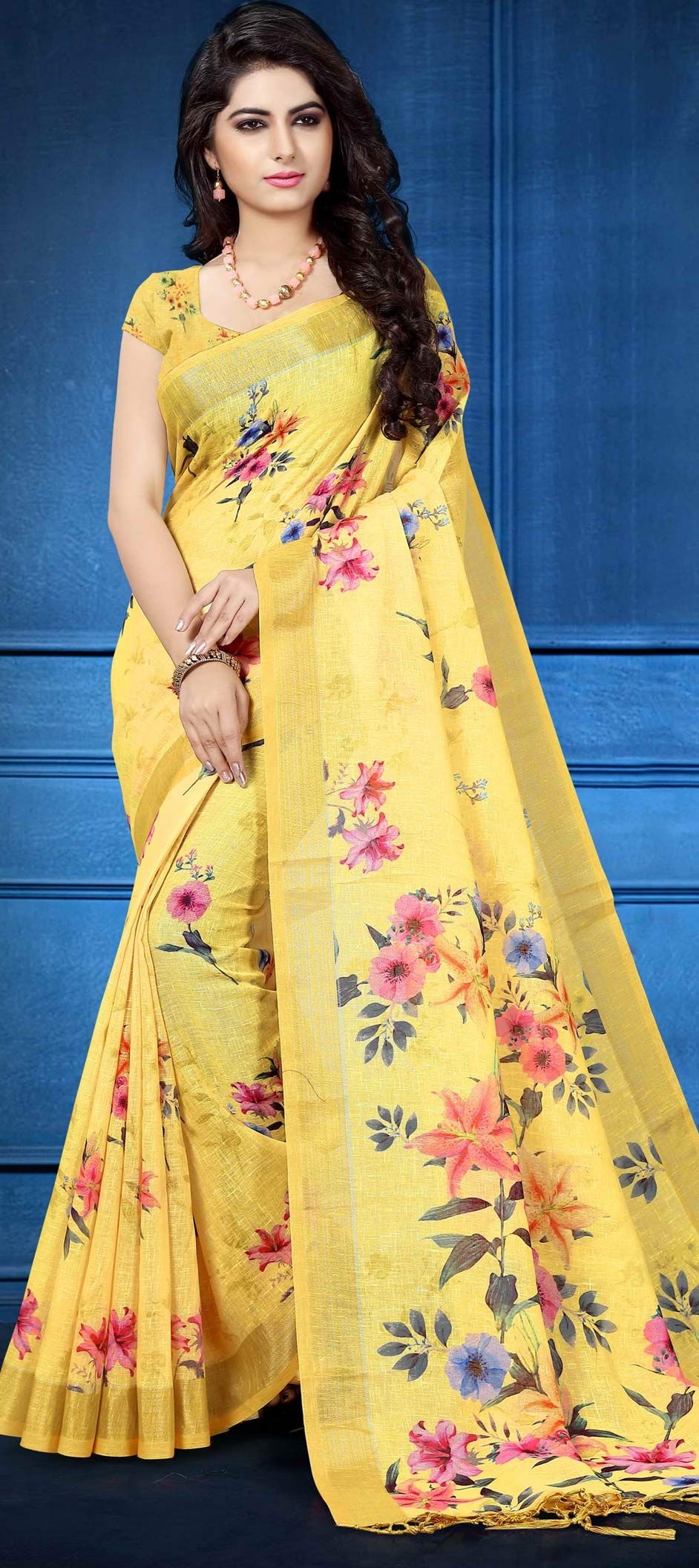 Yellow color Saree in Linen fabric with Floral, Printed work